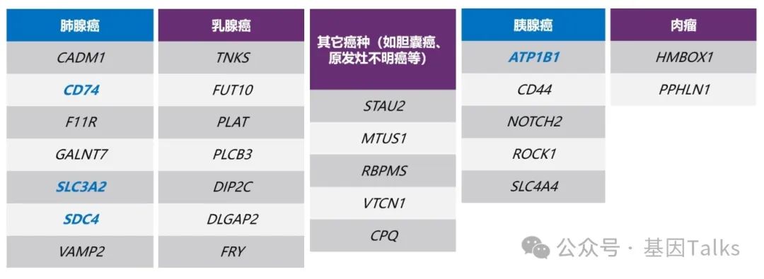 3)目前已发现多个NRG1融合配偶体:最常见的是CD74、SDC4、SLC3A2-均为跨膜蛋白。其中,NSCLC主要融合配偶体是CD74、SLC3A2和SDC4,PDAC主要融合配偶体是ATP1B1。