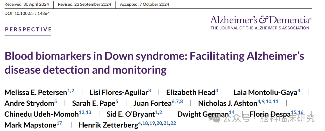 来源:Petersen ME, Flores-Aguilar L, Head E, Montoliu-Gaya L, Strydom A, Pape SE, Fortea J, Ashton NJ, Udeh-Momoh C, O'Bryant SE, German D, Despa F, Mapstone M, Zetterberg H. Blood biomarkers in Down syndrome: Facilitating Alzheimer's disease detection and monitoring. Alzheimers Dement. 2024 Nov 13. doi: 10.1002/alz.14364. Epub ahead of print. PMID: 39535517.