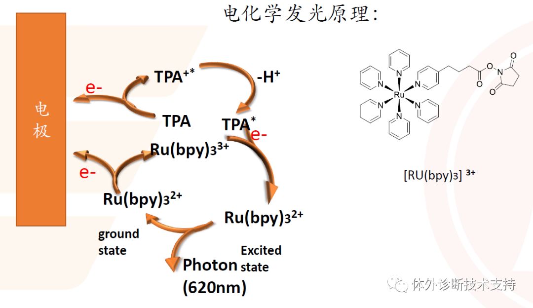 抗体/抗原表面具有多个活化基团(氨基/羧基),通过这些基团连接酶与抗体称为酶标记; 酶标记分为大分子与大分子标记、大分子与小分子标记; 变量多:抗体对的配对、“磁珠”与“酶标”的稀释度、合适的“配方”溶液、其他的试剂盒组分、孵育时间 化学发光:由于化学反应(通常是氧化)底物从基态跃迁为激发态,激发态返回基态时,跃迁能量以光子形式释放的现象。 综合来看,主流的5大发光技术各有优缺点,不能说技术谁优谁劣,但是从市场来看,Roche的电化学发光技术市场认可度稍稍领先;