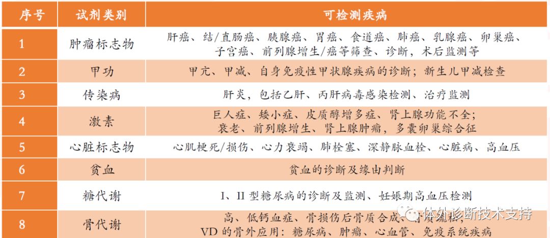 国内外主流的试剂技术类似,主流有直接化学发光(异鲁米诺(新产业)、吖啶酯(雅培)、间接(酶促)化学发光(丹纳赫、迈瑞、安图)、电化学(罗氏),各有优劣势,暂无明显技术替代的趋势,但是电化学发光被认为是第三代技术,技术上略略领先。 试剂的性能包括准确度、灵敏度、线性范围、抗干扰能力、存储稳定性、开瓶稳定性、试剂盒规格等;机器的性能包含检测速度、试剂位、样本位、仪器大小等,准确度是核心,通过与已获证产品的对比得到;其他性能间接影响准确度,需要结合具体项目标准、厂家性能以及客户需求综合评价。迈瑞医疗(300760.SZ)由于其在品牌、技术积累、研发投入及市场能力的优势被广泛看好。 化学发光临床广泛应用于临床。化学发光是免疫诊断的一种,是利用抗原抗体之间的特异性反应来测定体内疾病标志物浓度,从而判断人体身体状态的诊断方法,广泛应用于传染病、心脏疾病、肿瘤、妊娠检测等。 免疫检测标志物超过100个。免疫检测标志物统计超过100个,按照免疫反应中的角色,标志物可以分为抗体与抗原,其中抗原又包括大分子抗原与小分子抗原。