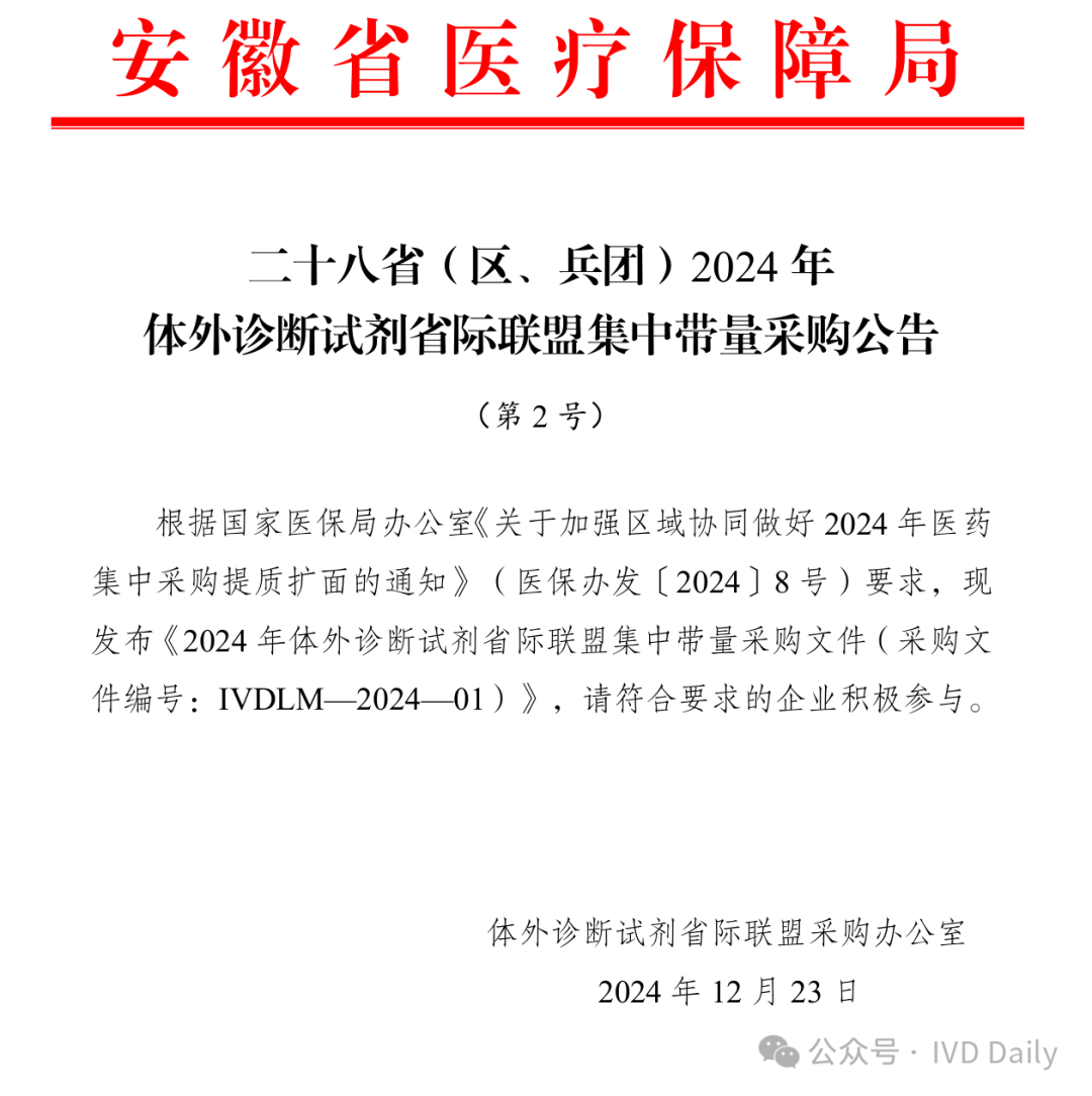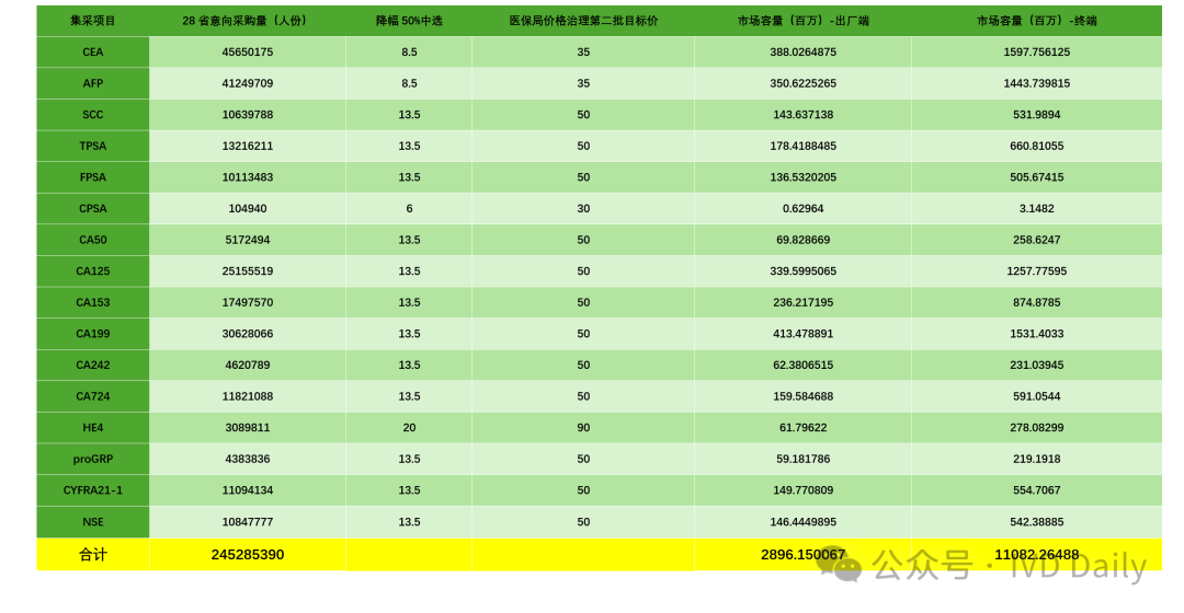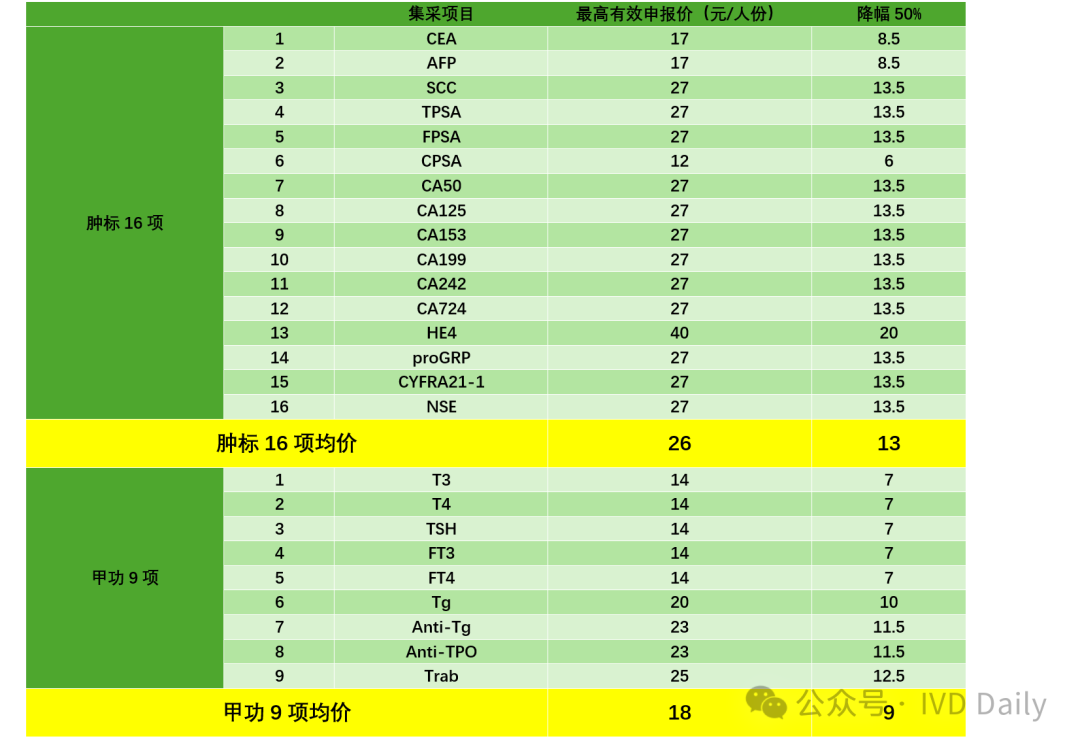 | 23日,安徽省医疗保障局牵头开展的肿标和甲功集采公布2号采购文件!安徽省、北京市、天津市、河北省、山西省、内蒙古自治区、辽宁省、吉林 省、黑龙江省、上海市、福建省、江西省、河南省、湖北省、湖 南省、广西壮族自治区、海南省、重庆市、四川省、贵州省、云 南省、西藏自治区、陕西省、甘肃省、青海省、宁夏回族自治区、 新疆维吾尔自治区、新疆生产建设兵团28省(区、兵团)医疗保障局肿标16项首年28省(区、兵团)采购意向采购量合计2.45亿人份,甲功9项首年28省(区、兵团)采购意向采购量合计3.05亿人份,合计28省肿标16项+甲功9项约5.5亿人份采购量!从出厂端来看,市场容量价格按照降价50%中选计算,肿标市场28省(区、兵团)约29个亿,甲功市场28省(区、兵团)约24个亿,合计一个近53亿的发光市场最大两类已经纳入集采!从终端市场来看,结合12月份初国家医保局公布的第二批肿标价格治理限价(HE4按照均价90元)计算,肿瘤标志物16项28省(区、兵团)终端市场容量约110亿!总体来看肿标+甲功终端市场约200亿,出厂端约53亿的市场,集采大刀加价格治理的政策轮番轰炸,有多少人正陷其中?个中辛酸恐怕只有局中人才了然!降幅50%中选价格,甲功均价9元,肿标均价13元!拟中选规则来看:肿瘤标志物十六项和甲状腺功能九项两类产品分别组套申报整体降幅,按降幅由高到低的顺序确定排名,降幅最高的为第一 名,次高的为第二名,依此类推。按照中选规则二:整体申报降幅高于50%(>50%)来算,肿瘤标志物16项均价13元,甲功9项均价9元!而实际只会更低,因为规则要求降幅不能等于50%!这个价格和各企业的最低中标价格差不多,详见如下文件:总体来看,政策还是相对温和,国产出厂价肿标在6-7元/人份,甲功在4-5元/人份,基本保证了渠道50%左右的空间;但对于进口品牌而言这价格相对难受,如某外企CEA省级最低挂网价13块多,和此次8.5元的差距还比较远,所以说集采价格体系重塑了外企对于市场的认知和接下来的市场布局!据路边社消息,某肿标大户外企这两天已经开始发放圣诞裁员大礼包!此次集采把国产和进口拉到同一起跑线,未来几年发光国产替代逻辑依然清晰!2024年岁末降至,随着安徽医保局2号集采公告的发布,发光厂家的价格厮杀才刚刚开始!展望2025乙巳蛇年,打工路还在,只是走法发生了翻天地覆变化。最后开标时间估计得到2025年一月份了,诸君静候3号文的公布!其实最后结果想必各位早已有答案,鹿死谁手不是目的,行业百花齐放才是春!