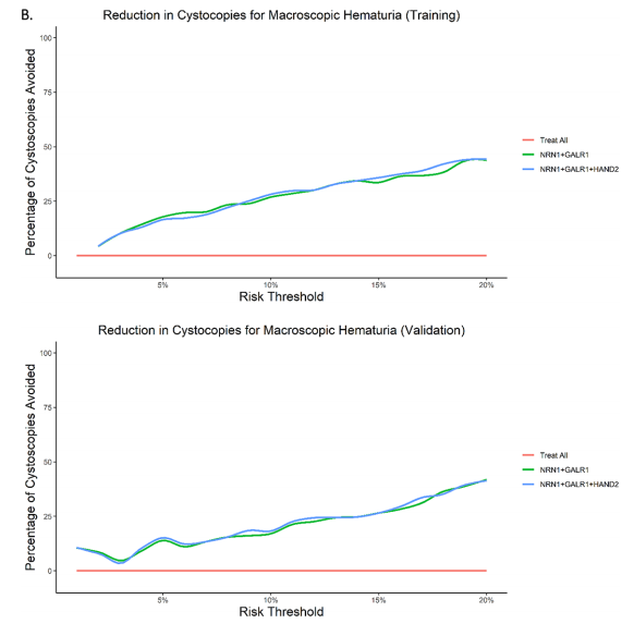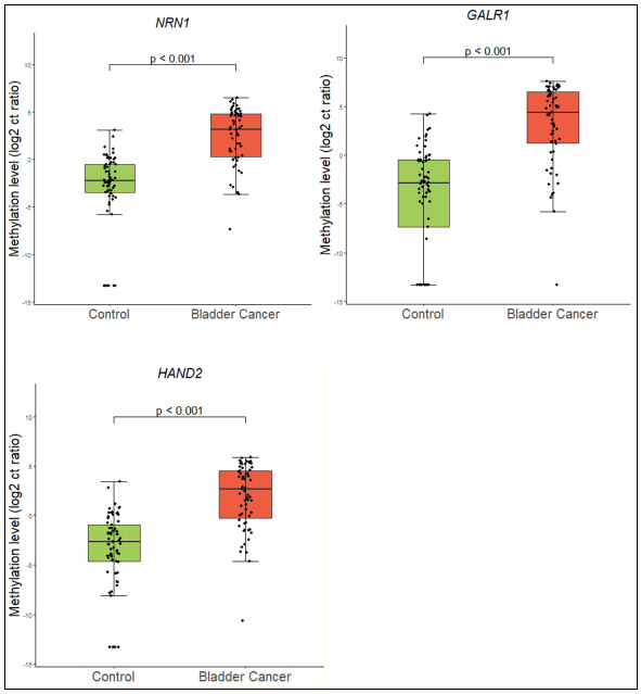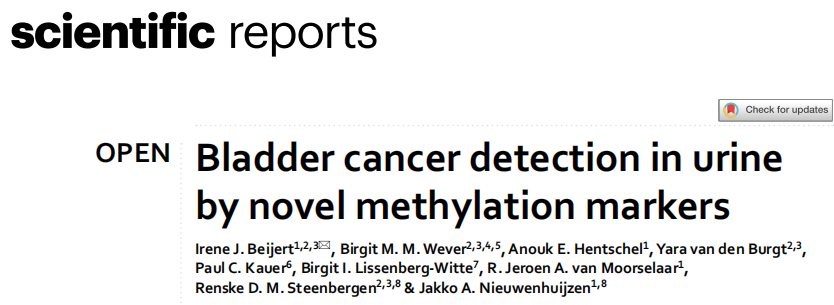 膀胱癌(BC)通常表现为无痛性血尿,通过膀胱镜检查诊断,然后经尿道行膀胱肿瘤切除术(TURBT)。虽然膀胱镜检查是发现和监测复发性疾病的可靠诊断工具,但它是侵入性的,昂贵的,需要经常去医院,并且有尿毒症等并发症的风险。因此,需要一种具有成本效益和非侵入性的检查方法来检测原发性和复发性BC。因此,开发具有强大诊断能力和易于应用于临床和门诊环境的无创BC尿液生物标志物是一项主要的临床需求。虽然DNA甲基化标记有希望,但诊断性能仍然可以提高。 近日,杂志Scientific reports上发表了一篇题为“Bladder cancer detection in urine by novel methylation markers”的文章。作者评估了11个候选甲基化标记物用于尿BC检测,确定了三个最有希望的标记:NRN1,GALR1和HAND2。联用标记物集显示AUC为0.94,敏感性为84%,特异性为96%。验证集获得了几乎相同的准确度 (AUC 0.89,敏感性76%,特异性93%)。根据临床情况,DCA提示膀胱镜检查可能减少20%至35%。此甲基化标记物在非侵入性BC检测中的出色诊断潜力,强调了它们对未来诊断策略的重要性。 图片来源:Scientific reports 主要内容 候选BC甲基化标记物的评价和选择 在15名对照组和15名原发性BC患者的尿细胞沉淀中评估了11种候选标记物(CDO1、TAC1、SOX17、LHX8、ASCL1、ZNF582、NRN1、GALR1、C2CD4D、CDH13和HAND2)的DNA甲基化水平。除C2CD4D外,病例中所有标记物的甲基化水平均显著高于对照组。三个标记NRN1, GALR1和HAND2表现出完美的诊断性能,AUC为1.00(如下图),因此选择它们进行后续的训练和验证。 候选BC甲基化标记物的评价。图片来源:Scientific reports 训练集DNA甲基化分析检测BC的诊断性能 检测69例对照和77例原发性BC患者尿细胞沉淀中NRN1、GALR1和HAND2标记物的DNA甲基化水平。这三种标志物的甲基化水平在BC患者中显著高于对照组(均P < 0.001)。NRN1的AUC为0.94,GALR1的AUC为0.93,HAND2的AUC为0.90。相应的敏感性和特异性NRN1分别为83%和96%,GALR1为88%和93%,HAND2为75%和100%(如下表)。联用结果显示NRN1/GALR1联用结果最佳,其AUC为0.94,敏感度为84%,特异性为96%。(如下表)。 3个基因甲基化分析检测BC的诊断性能。 图片来源:Scientific reports 验证集DNA甲基化分析检测BC的诊断性能 研究结果在一个独立的队列中得到验证,该队列显示BC患者NRN1、GALR1和HAND2的甲基化水平明显高于对照组(均P < 0.001,如下图)。在验证队列中的诊断表现导至NRN1的可比AUC为0.88,GALR1为0.87,HAND2为0.87。在验证队列中,NRN1/GALR1和NRN1/GALR1/HAND2标记板的性能几乎相等,AUC分别为0.89和0.89(如上表)。 验证队列中NRN1/GALR1/HAND2的甲基化水平。 图片来源:Scientific reports 甲基化标记物的临床应用 作者通过计算使用甲基化标记可能避免的膀胱镜检查次数来评估甲基化标志物在日常临床实践中的临床效用。假设显微镜下血尿患者的BC患病率为5%,肉眼血尿患者的BC患病率为15%,无论选择的风险阈值如何,使用我们的标记物都可以减少膀胱镜检查(如下图)。例如,通过在显微镜下血尿中使用风险阈值为10%的NRN1/GALR1标记组,可以避免约30%的膀胱镜检查,而不会遗漏任何癌症。 甲基化标记物的临床应用。图片来源:Scientific reports 总结与讨论 在这项前瞻性生物标志物研究中,作者定义了一个由3个基因(NRN1、GALR1和HAND 2)组成的新型甲基化标记组,用于在家中收集的尿液中检测BC。NRN1/GALR1和NRN1/GALR1/HAND2联合检测的AUC为0.94,相应的灵敏度为84%,特异性为96%。结果在独立验证队列中得到证实(AUC为0.89,敏感性为75%/76%,特异性为93%),表明其检测尿液中原发性BC的稳健性。 此研究的一个局限性是只包括原发肿瘤,这限制了研究结果对监测环境的直接适用性。此外,需要监测研究来验证复发肿瘤。本研究的优势在于新型尿液BC检测标记物具有优异的诊断性能,并且可以在家中收集尿液,并通过常规邮件发送到任何实验室,使其成为日常临床护理中易于应用且真正无创的方法。总之,研究表明,DNA甲基化标记NRN1、GALR1和HAND2在非侵入性检测BC方面具有良好的诊断潜力,并且这些标记能够大大减少膀胱镜检查的次数。这些发现强调了DNA甲基化标记在未来BC诊断中的高诊断潜力。 |