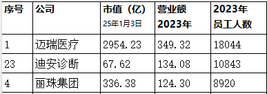 2023年和2024年是IVD行业抗压的两年,截止1月3日,我们统计了目前已上市企业的市值情况,市值过百亿的企业,仅有13家,其中头部的两家企业迈瑞医疗和万泰生物,其IVD业务的占比大概在20-40%左右,均没有超过50%。