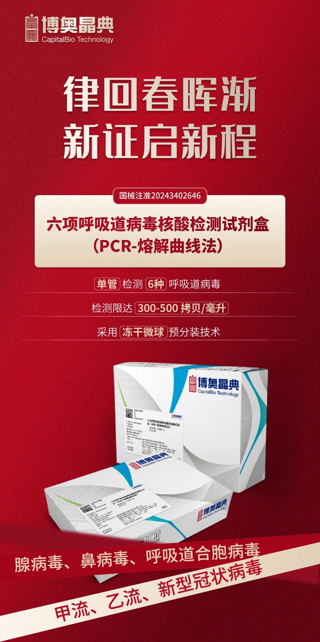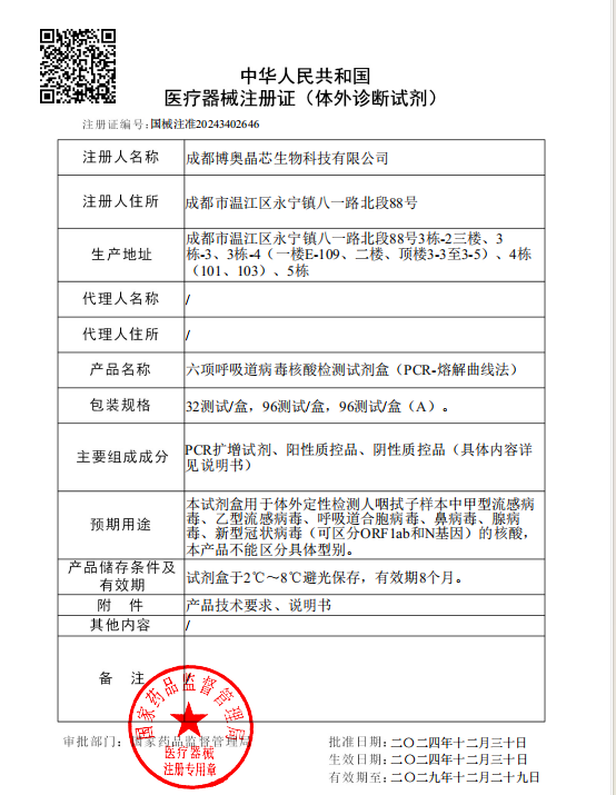 2024年12月31日,博奥晶典六项呼吸道病毒核酸检测试剂盒(PCR-熔解曲线法)正式获得国家药品监督管理局(NMPA)第三类医疗器械注册证(注册证号:国械注准20243402646)。该试剂盒可用于常见呼吸道病毒类别检测,精准甄别包含甲型流感病毒、乙型流感病毒、呼吸道合胞病毒、鼻病毒、腺病毒、新型冠状病毒共6种常见呼吸道病毒,辅助临床对呼吸道病毒进行诊断治疗。