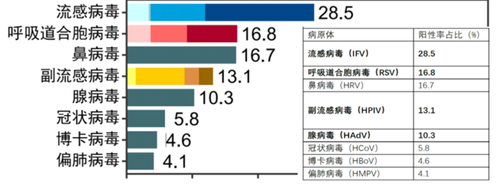 呼吸道疾病是一种高发疾病,感染人群广泛,发病率高,具有一年多次感染现象。病毒是引起呼吸道感染的主要病原体,感染类型复杂多样。中国急性呼吸道感染患者的监测数据显示:流感病毒、呼吸道合胞病毒、鼻病毒、副流感病毒、腺病毒是我国感染率较高的呼吸道病毒。另外,在后疫情时代,新型冠状病毒逐渐与流感病毒呈现此消彼长、相互依存的趋势。