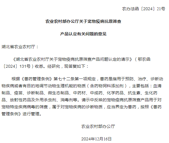 文/谷子 近日,农业农村部的一纸答复(农办法函〔2024〕21号),为宠物疫病抗原筛查产品的法律属性盖上了“兽药”标签。 事情的起因,源自湖北省农业农村厅的一份请示文件:宠物疫病抗原筛查产品(用于检测宠物疾病病毒的工具)是否属于“兽药”?农业农村部的答复给出了明确答案:属于兽药范畴,必须按照《兽药管理条例》进行管理。 按照《兽药管理条例》第七十二条第一项的规定,兽药不仅涵盖我们传统认知中的疫苗、抗生素,还包括用于预防、治疗、诊断动物疾病的各类产品——而抗原筛查产品正是这一条例所定义的“诊断物质”。 这意味着,企业在研发、生产到流通的每一个环节,都必须严格遵守兽药管理的高门槛要求。 什么是抗原筛查? 通俗来说,宠物疫病抗原筛查是一种用来检测宠物体内是否存在特定疾病病毒的技术。通过提取宠物的生物样本(如血液、唾液、组织等),这些产品可以快速识别病原体抗原的存在,帮助诊断宠物是否感染某种疾病。 技术的“内核” 1. 抗原检测:抗原是病毒或细菌的一部分,通过特定试剂检测它们的存在,可以迅速判断宠物是否感染。 2. 主流技术:快速检测试纸、酶联免疫吸附试验(ELISA)、荧光PCR等,都是目前市场上常用的技术手段。 3. 科研进展:一些领先企业已经将抗原检测的灵敏度推向细胞、分子层面。例如,正在研究如何更精准捕捉SARS病毒蛋白在动物中的抗原表达。 为什么它重要? 早期预防:在疾病刚萌芽时发现异常,帮助宠物医院和宠物主采取及时干预。 精准治疗:提供明确的诊断依据,避免不必要的治疗。 高效筛查:在跨境宠物检疫等场景中,抗原筛查是快速评估宠物健康的首选工具。 应用场景: 宠物医院:常规健康体检、术前评估、疾病监测。 家庭检测:便携式抗原检测试剂,帮助宠物主在家中完成初步筛查。 检疫与繁殖:为宠物繁殖、跨区域运输提供健康认证。 国际品牌: 未来,随着宠物医疗科技的进步,我们或许能看到更多革命性的产品。从精准诊断到家庭护理,再到疾病预防,每一个宠物的健康都将被“科学化”守护。而这次政策的推进,也将成为宠物医疗领域步入高质量时代的标志性节点。 |
