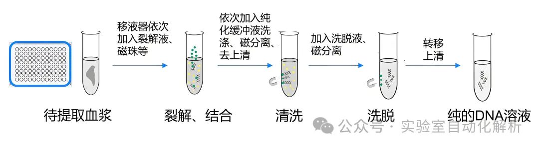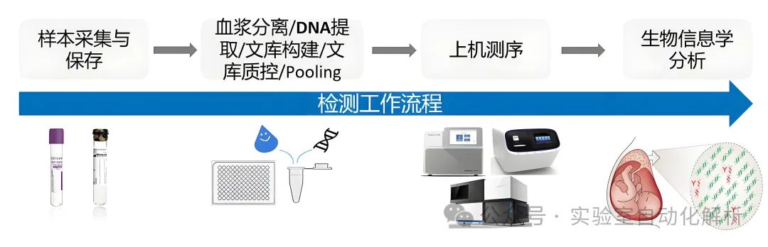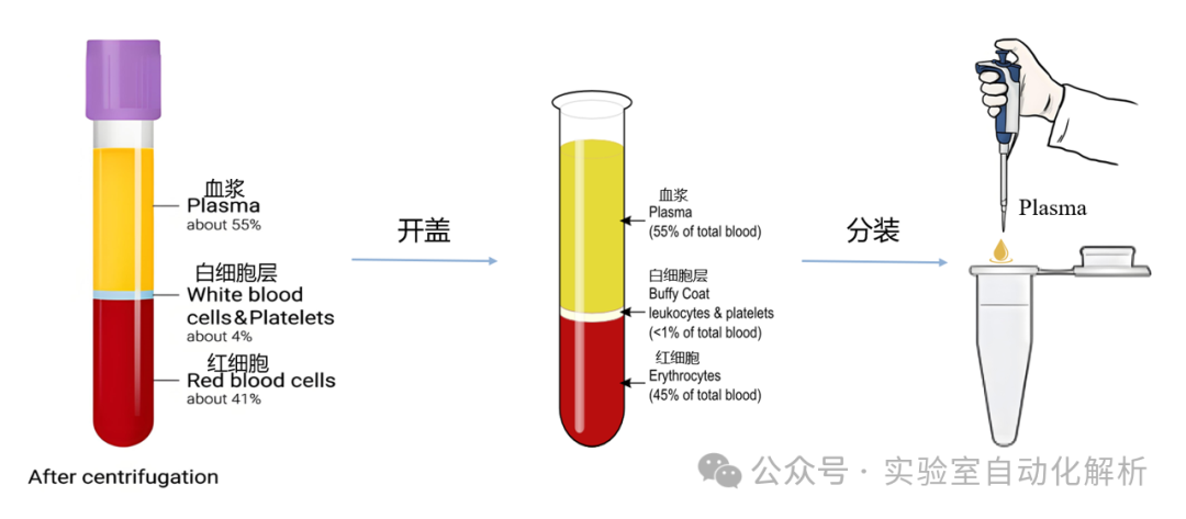 NIPT的检测流程通常涵盖以下步骤:(1)血液样本的采集与保存;(2)血浆分离,即血液样本的前处理,从全血样本中分离得到上层血浆;(3)DNA提取,即从血浆中提取核酸;(4)文库构建,通常遵循全基因组文库的构建流程;(5)文库质控,确保文库的可靠性;(6)Pooling,即将不同的DNA文库按照一定的规则进行混合;(7)上机测序,即将混合后的pooling文库进行测序操作,从而降低测序成本,提高测序通量;(8)生物信息学分析,即对测序结果进行数据分析。这一系列精确而有序的操作确保了检测的准确性和高效性。 在实验室常规处理流程中,主要包括以下几个环节:血浆分离、DNA提取、文库构建、文库质控、Pooling,随后是上机测序和生物信息学分析。在这些环节中,上机测序前的步骤通常被统称为“湿实验”,这些环节对自动化的需求尤为迫切。 血浆分离 血浆,作为抗凝全血经过离心后获得的上层清液,富含纤维蛋白原及其他凝血因子。由于其保留了血液成分的原始状态,并且产量优于血清,血浆在血液成分检测领域得到了广泛应用。这一特性使得血浆成为临床诊断和研究中的重要样本类型。 为了进行血浆中游离核酸的测序,所需的血浆必须高度纯净,避免母体基因组DNA的干扰。因此,在血浆分离过程中,必须严格避免接触白膜层。同时,为了确保实验的顺利进行,所需的血浆量相对较大,通常需达到500μL-1mL以上(因此,在血浆分离和提取阶段,操作通常采用离心管进行。而到了文库构建环节,由于所需体系体积较小,PCR管成为更合适的选择。这一转换过程,从大体积离心管到小体积PCR管的操作,可能会为实验人员带来一定的操作不便)。 一般推荐的血浆分离方法是两步离心法。孕妇外周血在4℃条件下进行1600×g低速离心10min,吸取上清液转入离心管中,在吸取血浆过程中不能吸到中间层的白细胞及红细胞,然后将上清液16000×g离心10min,吸取上清液至另一个2ml离心管中,避免吸到底层残留细胞。如不慎吸到细胞成分,应将吸取的血浆重新置回管中,重新离心后再进行血浆分离。 分离完的血浆样本可在-20℃暂存1周,应避免反复冻融,可在-70℃以下长期保存。此步骤操作应双人复核标本信息。正常血浆呈透亮的黄色或淡黄色,无明显溶血;如有严重溶血或颜色异常等情形,须登记注明标本状态并重新采血。 痛点分析 在血浆分离过程中,为确保游离核酸测序结果的精确性,必须获得高度纯净的血浆,避免母体基因组DNA的污染。这一过程要求操作人员极为细心,严格避免触及白膜层,这是一项对技术熟练度有较高要求的专业操作,对于初学者而言,具有一定的挑战性。 自动化解决方案 在当前自动化血液样本组分分装领域,已知的有Hamilton EasyBlood高分辨成像血液分装系统,它专长于对离心后的全血样本进行血浆和白膜层的自动识别与分装。此外,Hamilton EasyBlood系统具备与自动化开盖机和二维码阅读模块(Hamilton LabElite IDCapper)的无缝整合能力,能够实现血液样本管条码识别、分层界面识别、吸取、分装、留样以及开关盖等操作的全面自动化。 这款设备我尚未亲自体验,非常欢迎那些已经使用过的朋友们留下您的宝贵意见,分享您的使用体验。 在处理大批量样本时,人工开启样本管盖的操作不仅繁琐,而且极为耗时。因此,采用自动化仪器进行样本管的自动开盖,能够显著提升工作效率,成为更为理想的选择。另外,自动化操作流程中,将血浆直接分装至深孔板,可简化后续的提取步骤,提高实验操作的便捷性和效率。尽管如此,剩余的样本仍需分装至EP管中,以便进行妥善保存。 DNA提取 DNA提取技术多样化,在市场上广泛应用的提取方法主要有磁珠法、硅胶膜离心柱法等。其中,磁珠法在核酸提取过程中表现出较高的自动化兼容性,使得操作更加便捷和高效。 正如新型冠状病毒肺炎诊疗中新型冠状病毒核酸检测通量高、时效性要求高的特点,对核酸提取技术提出了新的要求——高效、便捷、大通量,原有的手工提取核酸的方法,已经很难满足大规模、高通量的实验要求,在这种背景下,自动化核酸提取应运而生。 磁珠法自动核酸提取技术已达到高度成熟,根据移液特点主要分为磁棒法和移液法两种类型,前者转移的是磁珠,后者转移的是液体。 磁棒法自动核酸提取仪相对应用较多。以ThermoFisher KingFisher Flex系统为例,该设备利用特质的一次性磁套和磁棒进行操作,每批次能够高效处理24至96个样本。 操作流程包括将样本与功能化磁珠及试剂混合后,均匀分配至板孔中。在启动运行时,系统会自动装载磁套。仪器通过磁力作用从溶液中捕获磁珠,随后将其精准释放至含有下一步分离所需试剂的板孔内。这种磁珠的收集与转移机制,确保了洗涤过程的高效性、洗脱步骤的快速性以及整个处理流程的顺畅性。 相对于移液法,磁棒法的优点在于:(1)每一步的液体不会残留,因为磁棒只带走磁珠,然后转移到下一个步骤相应的反应孔中;(2)其编程简单,易维护,机器设备成本更低。 缺点就是不能将手动法磁珠提取试剂直接拿来使用,而需要根据机器特点优化试剂操作。 移液法自动核酸提取仪主要通过移液工作站来实现,如Beckman, Tecan, Hamilton等设备,它利用移液器精确转移液体,以完成核酸的分离与纯化。 相较于磁棒法,移液法的优势体现在:(1)移液过程中有效避免了液体滴落导至的交叉污染;(2)兼容多种磁珠法核酸提取试剂,几乎所有适用于