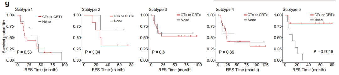 作者确定了免疫景观和多组学亚型之间的关联。亚型5在低隐性MAP负荷组和HTE组中最为丰富。亚型5患者还通过NF-κB表现出高活性TNF-α通路。辅助化疗或放化疗的使用大大提高了亚型5肿瘤患者的生存(下图g)。相比之下,接受辅助化疗或放化疗的其他亚型患者的生存率没有明显改善。在接受辅助化疗的总体人群中,与其他亚型相比,亚型5也表现出最有利的预后,这强调了亚型5可能与辅助化疗的临床获益相关。