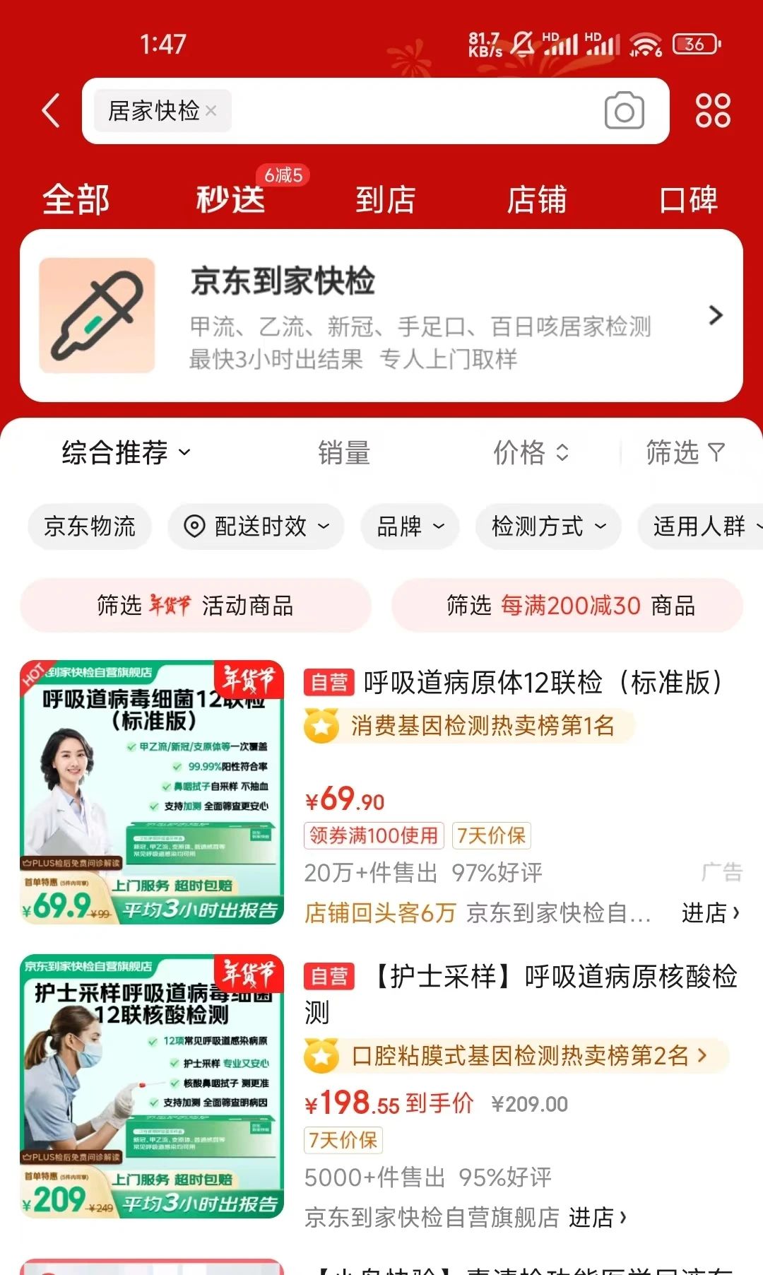 与此同时,京东到家快检的呼吸道病原体12联检(标准版)已经热销20万份,售价69.90元,霸榜消费基因检测热卖榜第一名。美团居家快检没有销量统计因此没法作对比,但从京东和美团的定价上来看,两家也均没有打价格战,新人价都是69.9元,标准价99元。