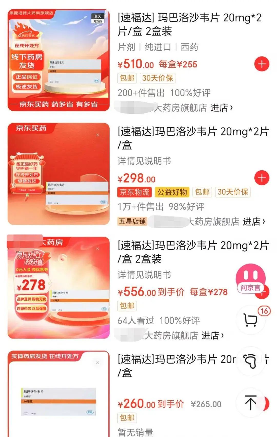 据39深呼吸查询发现,玛巴洛沙韦在线上不同平台的不同药房价格相差较大,没有最贵,只有更贵。在淘宝、京东、美团平台上,店铺售卖20mg×2片规格的玛巴洛沙韦单盒价格,普遍在235元——365元之间,更有部分药房定价高达400-500元以上。而成人一次服药就需要2片,药价贵到离谱,让人直呼“吃不起”。