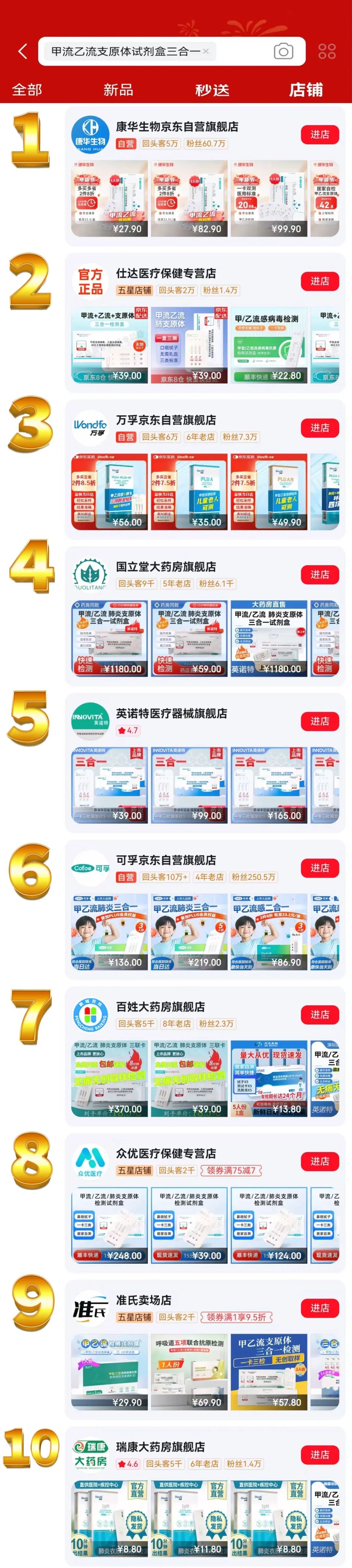 图 京东关键词甲乙流试剂排名10个店铺谁能越过这堵墙,从这堵墙看到机遇,也许还有重生的希望!笔者因为有三点: 1、功能性:C端消费者为非专业人士,听不懂,也不想听你讲灵敏度是多少?特异性达到多少?检出率占比多少?就是做完之后和去医院做的结果符合怎么样? 简而言之,我测完我感染了甲流,不放心去医院专业检测是否能确诊?确诊的概率是多少? 开始消费者大多数当成高端玩具的试玩心态,当然C端消费者,因为不可控因素多,结果影响因素较多,好的产品在不同的操作者 这让笔者想起,新冠检测期间,有聪明人在视频平台分享,把胶体金从中间剪开,一个当成2个用。