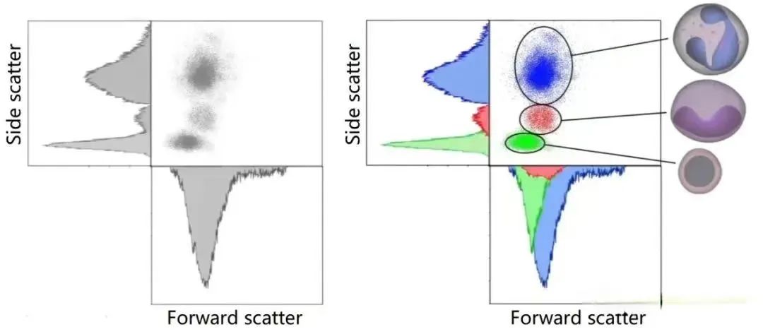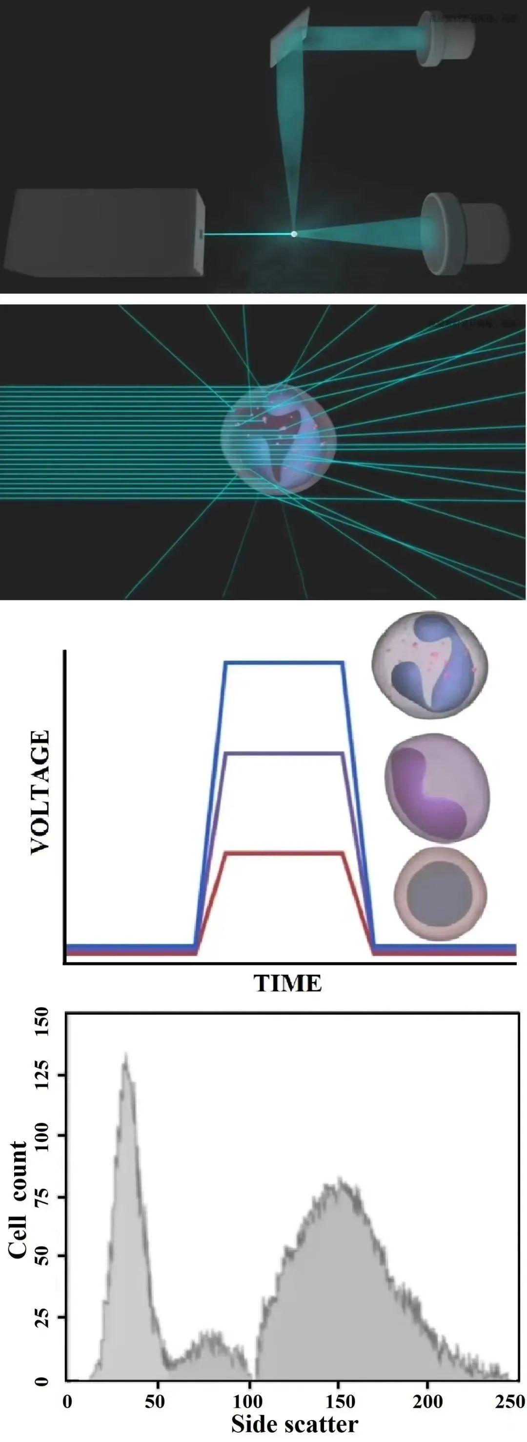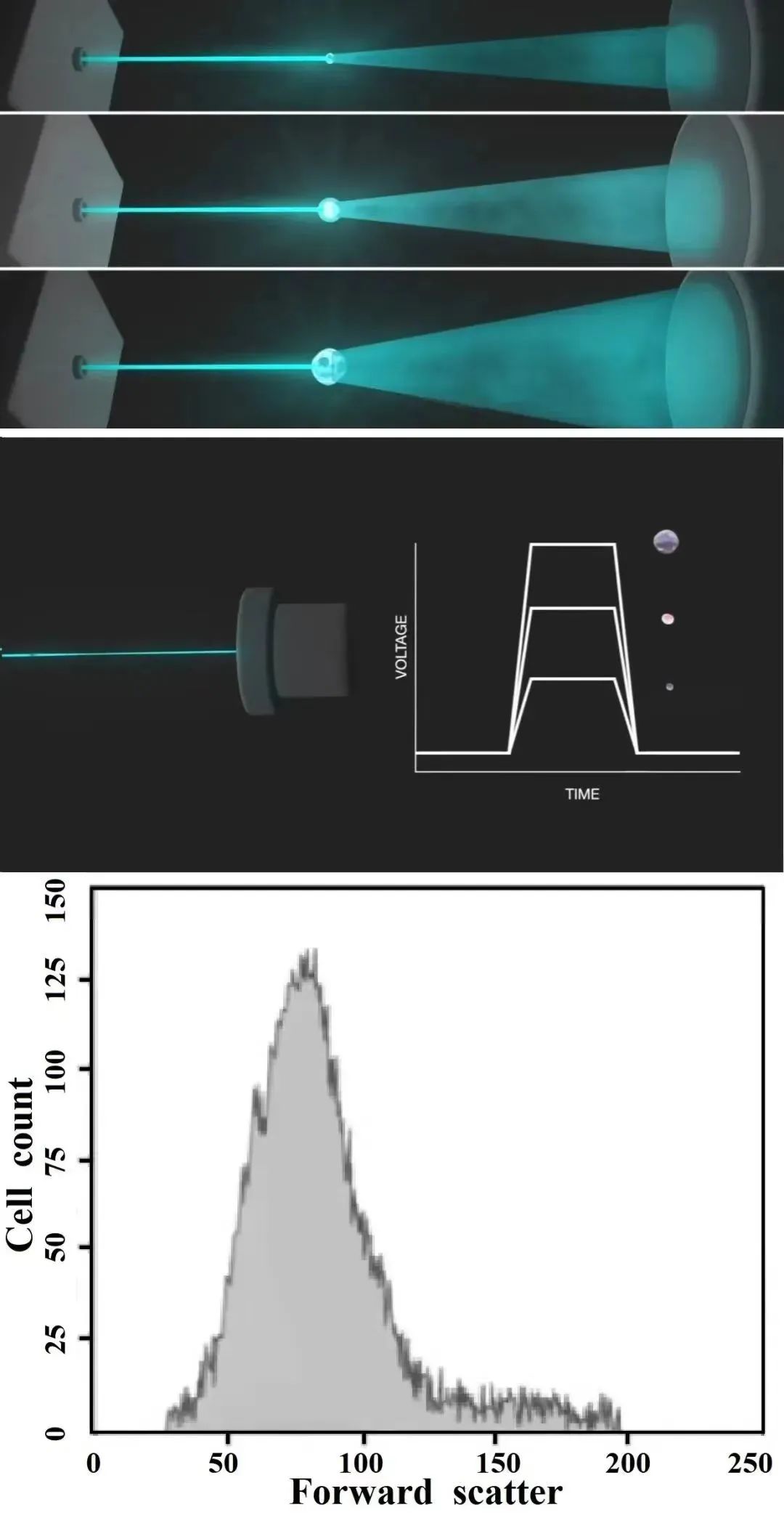 流式细胞术(Flow Cytometry,FCM)从字面意义理解,Flow—Fluid、Cyto—Cell、Metry—Measurement,是一种对液流中排成单列的细胞或其它生物微粒(如微球,细菌,小型模式生物等)逐个进行快速定量分析和分选的技术。其特点是通过快速测定库尔特电阻、荧光、光散射和光吸收来定量测定细胞DNA含量、细胞体积、蛋白质含量、酶活性、细胞膜受体和表面抗原等许多重要参数。根据这些参数将不同性质的细胞分开,以获得供生物学和医学研究用的纯细胞群体。广泛运用于从基础研究到临床实践的各个方面,涵盖了细胞生物学、免疫学、血液学、肿瘤学、药理学、遗传学及临床检验等领域,在各学科中发挥着重要的作用。 特定波长的激光束直接照射到高压驱动的液流内的细胞,产生的光信号被多个接收器所接收,包括激光束直线方向上接收到的散射光信号(前向角散射)和激光束垂直方向上接收到的光信号(散射光信号(侧向角散射)和荧光信号)。液流中悬浮的直径从0.2-150 μm的细胞或颗粒能够使激光束发生散射,细胞上结合的荧光化合物被激光激发后能够发射荧光。散射光信号和荧光信号被相应的接收器接收,根据接受到的信号的强弱从而反映每个细胞的物理学特征。 将待测样品制成单细胞悬液,在鞘液的包裹下进入流式细胞仪内的检测区域,细胞在激光的照射下会发生散射和折射,产生的散射光信号和荧光信号由不同的通道接收。其中前向角散射光(FSC)的强度与细胞直径成正相关,可以理解为细胞直径越大,FSC越强,细胞直径越小,FSC越弱。所以可以利用细胞的FSC值初步比较细胞的大小,利用FSC值对细胞进行分群和分类。 侧向角散射光(SSC)的强度与细胞内颗粒结构复杂程度成正相关(与细胞中所含的细胞器、细胞核等的数量成正比),可以理解为细胞内颗粒结构越复杂,SSC越强;细胞内颗粒结构越简单,SSC越弱。所以可以利用细胞的SSC值初步比较细胞的颗粒度,利用SSC值对细胞进行分群和分类。 当细胞通过激光束时,检测器会检测到细胞或颗粒的散射光,放置在前面的检测器检测FSC值,而放置在侧面的多个检测器检测SSC值。通过综合分析前向散射FSC和侧向散射SSC的数据,便能根据细胞大小、形状和复杂度将其进行分群分类。由于样品细胞不需要标记任何荧光化合物偶联抗体,直接上样分析得到FSC值和SSC值,其值代表细胞的大小和颗粒度两个物理特征,所以FSC-SSC散点图又称为 “物理图”。 当细胞悬液放入样品管中,被高压压入流动室内。流动室内充满鞘液,在鞘液的包裹和推动下,细胞被排成单列,以一定速度从流动室喷口喷出。在流动室的喷口上配有一个超高频的压电晶体,充电后振动,使喷出的液流断裂为均匀的液滴,待测细胞就分散在这些液滴之中。将这些液滴充以正、负不同的电荷,当液滴流经过带有几千伏的偏转板时,在高压电场的作用下偏转落入各自的收集容器中,没有充电的液滴落入中间的废液容器,从而实现细胞的分离。流式细胞仪除了根据FSC和SCC散射度或荧光(如DNA、RNA或蛋白含量,酶活性,特异抗原) 散射度差异来分离细胞外,更多的采用细胞表面抗原标记的荧光强度差异来分离细胞。每种细胞表面具有独特的抗原,当形态学检测难以区别时,免疫表型参数对细胞分选有决定性作用。