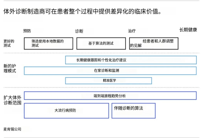 诊断的当前趋势 如今,诊断领域正从传统的后台付费服务角色向医疗保健服务生态系统中的关键利益相关者角色转变。有三个主要转变为数字和分析在体外诊断(IVD)行业的转型中创造了机会: 改进诊断测试本身:卫生系统期望在诊断方面实现两项主要改进。其一,为基于结果的医疗保健提供真正的测量指标,即超越简单的结果,将其与关键结果相联系。其二,将测量结果转化为见解提供给临床医生,结合当地环境、趋势和患者特定数据点,帮助医生做出更准确的护理决策。 转变护理服务:诊断作为临床决策的核心,是未来护理服务的关键组成部分。未来护理服务包含三个主要要素:一是新的护理模式,如家庭和虚拟护理,诊断需定义新工作流程和测试以实现远程护理且不牺牲质量;二是更加注重预防,需要新的 IVD 测试以更准确、经济地筛查患者;三是个性化医疗,IVD 参与者需筛选新诊断面板,让医生为患者选择正确疗法。 扩大医疗保健领域的诊断范围:诊断测试在疾病识别之外的广泛应用将对 IVD 参与者和社会产生重大影响。例如,可作为未来大流行病和卫生紧急情况的主要防线,还能提高药物开发的效率和有效性。 数字诊断将数据和分析与传统 IVD 测试相结合,产生新的临床见解和更高效的工作流程。麦肯锡的研究显示,与诊断相邻的部分数字市场,如临床决策支持、远程患者监测和人口健康管理,预计在未来几年将超越核心诊断市场。虽然其他参与者如健康科技和数据公司也关注这一领域,但 IVD 公司因其数据生成设备已融入关键临床工作流程,有权发挥作用并成为医疗保健服务生态系统中的关键利益相关者。 数字诊断中的适用范围 任何新的诊断测试或解决方案,无论是否数字化,都必须满足三个标准才能成功。 首先,新的数字诊断解决方案必须提供卫生系统领导者易于理解的价值,例如明显改善患者的治疗效果。虽然更好的敏感性和特异性有一定好处,但由于患者治疗过程中的效率低下和生物标志物的自然波动等因素,这些指标的增量改进通常难以转化为更好的结果。相反,确保正确使用诊断测试并促进其解释,同时应用患者和人群特定背景,能带来更大的结果改善。因此,探索数字诊断的第一步是确定 IVD 制造商可以在哪些方面提供差异化的临床价值,包括开发使用本地数据的筛查测试、提供长期健康跟踪和个性化治疗建议以及开发伴随诊断算法等。 其次,通常需要将整个患者旅程中的多个用例组合在一起才能提供价值。以胆固醇检测为例,数字诊断可利用风险评估长期整体健康状况,为患者提供量身定制的建议并跟踪结果,提供更好的护理。这需要多个使用案例的组合,如根据患者和人群调整的洞察、长期健康跟踪和个性化治疗建议以及家庭诊断和监测。诊断参与者需思考如何整合正确的用例并更广泛地参与健康之旅,可通过有机发展或合作伙伴关系及并购实现。 轻松集成到临床工作流程中 新的测试和解决方案若能无缝集成到现有工作流程中,或引入更简单、高效的工作流程,将更具优势。由于当前医疗保健环境面临工人短缺和倦怠问题,卫生系统不会对增加工作负担的新诊断系统感兴趣。 例如,一种筛查常见病症的家庭测试,要被采用需具备完整工作流程,包括将数据连接到电子病历、建立远程医疗连接并生成医生易理解的见解或报告。IVD 参与者可能无法拥有所有工作流程组件,需仔细评估参与的地点和方式,以确保工作流程顺利和最大程度的采用。 为卫生系统提供成本效益 考虑到卫生系统面临的通胀压力,成本在短期内应是重中之重。IVD 参与者需将硬性成本效益指标传达给医疗保健从业者、实验室和其他客户。 如何在数字健康生态系统中发挥作用 IVD 参与者不仅可以选择在患者旅程中增加价值的阶段,还可以选择如何在这些领域最好地提供数字诊断。 数据采集:许多 IVD 参与者已在收集数据,扩大 IVD 设备之间的连接以实现集中、标准化的数据收集,可提供更强大的数据集用于分析、了解趋势和管理人群,对实验室参与者尤其有价值。 数据集成:IVD 参与者可能缺少关键用例所需的所有数据,可考虑通过获取数据或充当中间件来组合数据源,为 IVD 制造商或客户解锁新用例。随着更多患者旅程的互联,数据集成的价值也在增加,其中诊断数据是关键组成部分之一。 数据产品:数据依赖型产品是诊断参与者较有经验的领域,如下一代测序、伴随诊断和液体活检。IVD 参与者还可创建面向客户的产品,改善临床决策、提供更好用户体验并简化操作,在分子诊断和蛋白质组学领域可能同样有价值。 数据服务:IVD 参与者在医疗技术参与者中可能处于有利地位,提供与设备实时数据配对的服务,可为临床管理、测试成本管理或预测维修提供巨大价值。 如何开始使用数字诊断 数字诊断具有挑战性,要求 IVD 参与者构建新能力、应对复杂的数据监管环境并阐明与客户产生共鸣的价值主张。以下五项举措为追求数字化诊断的成功战略奠定基础: 定义清晰数字战略:明确将数字解决方案与临床护理的有意义改进联系起来,从结果和成本角度出发,而非单纯考虑 “货币化”。 以客户为中心:让客户需求指导产品开发,涵盖应用程序、功能和基础设施,通过密切合作进行迭代,确保早期采用。 寻找合作伙伴:尽早找到合适伙伴进行大规模投资,弥补在云托管、网络安全
