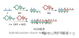 典型的HCR过程中,引发剂触发两种DNA发夹之间的级联杂交事件。设计发夹型探针H1和H2,H1包括1´,2´,3和2四个部分,其中2和2´有18对碱基互补成双链作为H1的茎部,3为发夹结构的环部,1´为在发夹结构茎部延伸出的单链粘性末端。H2包括3´,2´,1和2四个部分。其设计和H1相似,1,2,3可分别与1´,2´,3´互补。当没有引发链12存在时,虽然H1和H2中有部分链可以互补,但由于H1和H2分别形成茎环,二者在溶液中均能稳定存在,不会相互杂交而彼此打开。当加入引发链12时,12首先与H1茎部的粘性末端1´2´互补,使H1的茎环结构打开,暴露出32单链,打开H2的发夹结构,接着暴露出于与H1互补的12,可以继续打开H1,依次循环往复,形成由H1和H2交替杂交形成的长链带缺口的双链DNA聚合物。