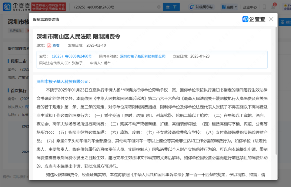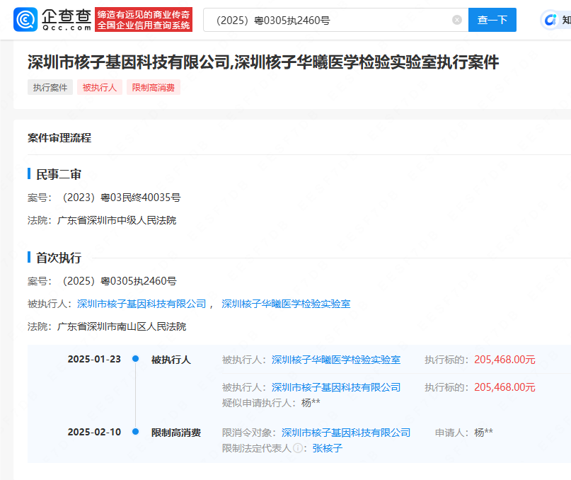 企查查APP显示,2月10日,深圳市核子基因科技有限公司及其法定代表人张核子因在一劳动争议案件中,公司未按期履行生效法律文书确定的给付义务被限制高消费。案件流程显示,今年1月该公司因此案被强制执行约20万元。 张核子,男,毕业于中国医科大学,医学硕士。现任核子基因集团(深圳)董事长、深圳市核子基因科技有限公司等多家公司法定代表人。 他最火的时候,是2022年核酸检测开展的如火如荼的时候。张核子打造的核酸帝国核子华曦实验室,覆盖了45座城市,累计检测超7亿人次,被称为“核酸大王”。 有网友称“哪里有他的公司,哪里疫情爆发”,随后兰州卫健委的一则“核酸造假”的通报,让核子华曦引爆舆论,全网寻找张珊珊,导火索都指向了张核子。 疫情消退后,陆续传出张核子进军房地产、预制菜的消息,每次都能引起舆论关注。 2024年,张核子入驻抖音,短短一个月,他已经更新了22条视频,目前收获了5.1万粉丝。 深圳市核子基因科技有限公司(简称核子基因)始创于2012年,是一家集基因技术研发、市场应用于一体的高新科技型企业,分司法鉴定、医学检验、健康管理,科研服务四个板块。 |