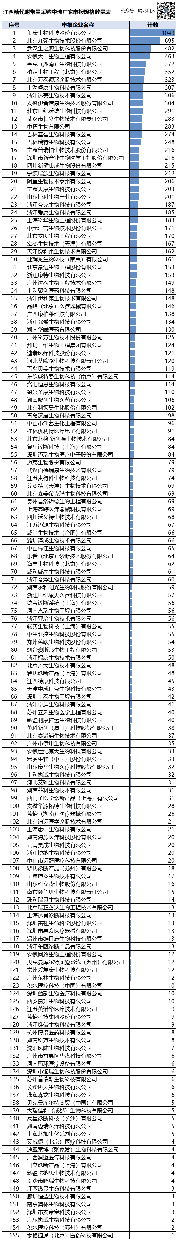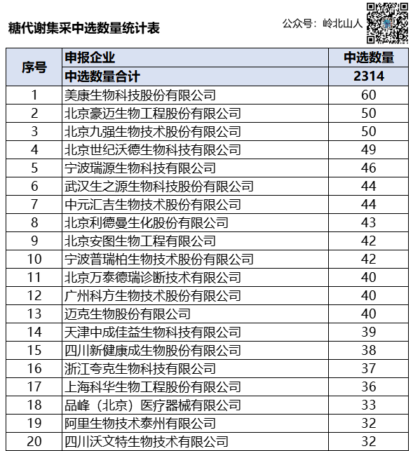 此次糖代谢带量采购,申报企业190家,参与报价企业181家,9个厂家未参与。成功解密181家,参与率95%,从中选的数据来看,155个厂家中选,中选率85%。 从品规来看,一共有3363个品规参与此次带量采购,181个厂家参与3191个品规。中选规格只有2314个,规格中选率只有72%。唱标现场我们就分析过,此次糖代谢集采,出局厂家数量较多,至少有877个品规未中选,这也是历次采购中,比例和数量最多的一次。本次集采的35个产品,没有一个厂家拥有全部产品的注册证,最多的北京世纪沃德有33个注册证,其中20个产品参与人份竞价;北京安图、安徽大千、广州达泰三个公司,均有32个产品注册证,美康生物30个产品,毫升和容量均参与。从中选数量来看,美康生物30个产品的60个品规全部中选,数量最多,北京豪迈和九强生物分别有50个品规中选。