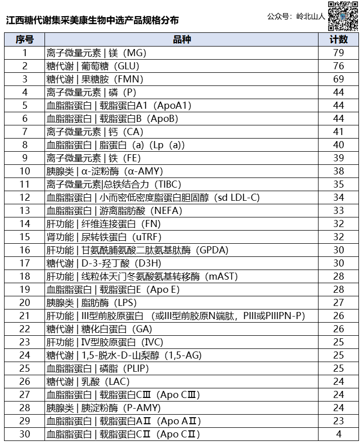 根据公布的结果,此次带量采购,一共有155个厂家的14761个规格中选,其中美康生物中选规格最多,达到1049个,占总体规格数量的7%,其次是九强生物和武汉生之源。对于开放试剂而言,美康生物的规格数量绝对第一,这也迎合了市场需求,能满足各种机型规格的需求。 通过分析我们发现,在中选的产品中,美康生物以30个产品60个品规稳居第一。而如果将1049个规格匹配中选产品,平均每个产品的中选规格超过30个。 其中镁离子的规格数量达到79个,而除载脂蛋白CⅡ(Apo CⅡ)外,其他产品的规格均超过20个。至此,江西牵头的糖代谢生化试剂已经公布中选结果,也完成了二次分量工作。江西作为牵头省份,将于2025年3月1日开始执行,而联盟省份也会随着中选结果的公布,逐步实施。对于生化试剂而言,已经有89个产品分三次纳入带量采购范畴。对于市场来讲,由于报量的原因,格局基本已经稳定,要想实现大的突破,已经很难。对于头部厂家而言,虹吸效应明显。今年也是肝功集采实施第一个周期,江西医保局是否会再次牵头完成肝功集采的续标工作,目前不得而知。但有一点可以肯定,就是随着集采的不断推进,生化试剂市场已经逐步开始收缩。 而对于产品不全,且未能全部入围的厂家,在市场准入端已经受到限制。而随着集采压缩中间利润空间,终端选择产品的主动权逐步加大,小厂家产品的市场份额进一步压缩。