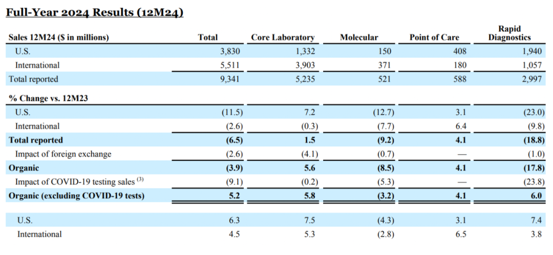 ▲雅培诊断2024年细分业务营收传统诊断:营收52.34亿美元,同比+1.5%,增长主要得益于免疫测定、临床化学、血液学和血液筛查测试板块的“持续强劲需求”,但一定程度上受到去年实施的中国集中采购政策的影响; 快速诊断:营收29.97亿美元,同比-18.8%。主要受新冠疫情检测相关销售额下降的影响,若不计入这部分销售额,快速诊断业务销售额同比增长6.0%。其他产品的销售实现了快速增长,包括用于流感、链球菌性咽喉炎和呼吸道合胞病毒的呼吸疾病检测产品; 分子诊断:营收5.21亿美元,同比-9.2%。主要受新冠疫情检测相关销售额下降的影响。若不计入这部分销售额,分子诊断业务销售额同比增长3.2%。 床旁诊断:营收5.88亿美元,同比+4.1%,血糖监测仪和心脏标志物检测均实现增长。