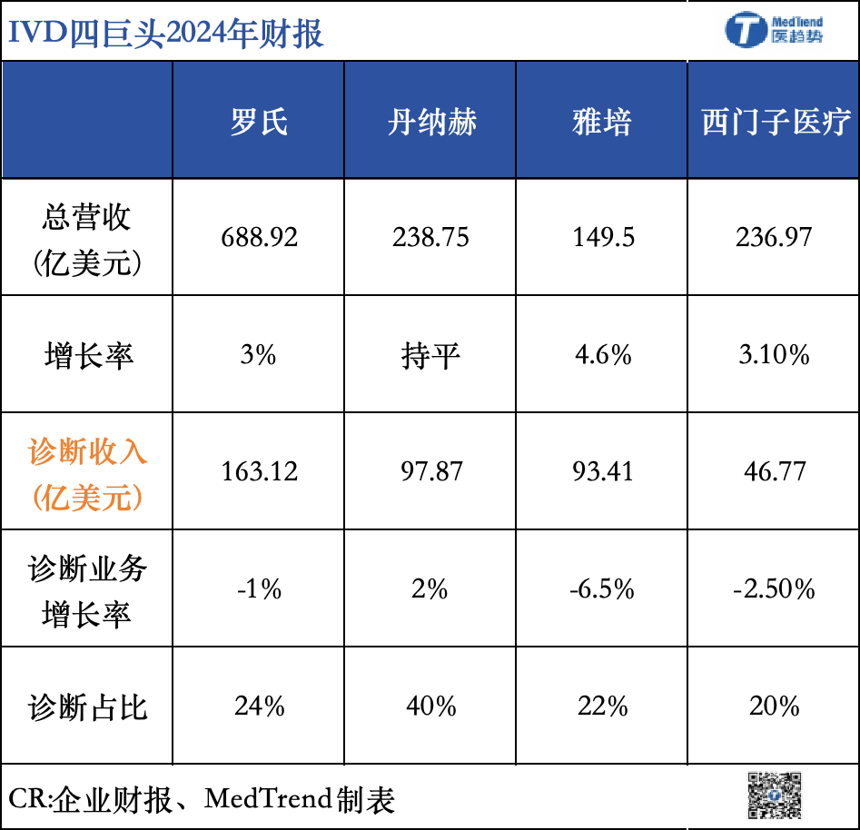 本土供应链弱势,让雅培在IVD四大家中国产能相对较弱,2024年,雅培中国重点围绕核心实验室和POCT领域本地化产能提升。 2024年10月,雅培实现Alinity i和GLP自动化系统本地化,加速了免疫模块和自动化流水线的本土生产,从成本管控方向应对集采,预计2025年正式投产,有望新增年营收5亿元。 丹纳赫:积极应对,调整重心 由于集采影响,其诊断业务核心收入下降了2%。丹纳赫首席财务官Matt McGrew表示,公司认为与集采将在未来几年产生每年5000万美元的不利影响,因为价格会降低约50%。 不过,丹纳赫CEO Blair表示,公司继续“将中国视为中期和长期的机会,因为基本面是正确的”。 不过,2025年,丹纳赫仍旧要面临集采、呼吸道检测双重挑战!而丹纳赫表示会将重点专注于分子诊断、临床诊断等高增长终端市场。 西门子医疗:裁员见效!下滑收窄,业务利润+7.8% 受集采影响,西门子医疗中国区下滑明显,达到-10%,而2024年,西门子医疗诊断业务经过几轮裁员,并淘汰传统产品线。 据2025年Q1最新财报显示,中国区下滑收窄。通过人员精简和传统产品线淘汰,诊断业务利润+7.8%。 首席执行官Bernd Montag在电话会议中表示,“公司将从2025年起逐步停止对四种旧有检测平台的支持,转而将客户迁移至具备扩展自动化能力的新一代Atellica仪器系列。” 当然了,不止是在化学发光赛道,以此前外企的“统治区”,IVD高端领域流水线赛道为例,2024年上半年中国市场公开签约数量来看,迈瑞第1、基蛋第2、罗氏第3、贝克曼第4、亚辉龙第5;雅培诊断第12、西门子医疗第13。 ***数据来源:老刘话IVD 未来,同样的故事还会在IVD里的其它细分领域里不断上演。 于是2024年,我们看到IVD四巨头不同的动作。当然其他国产IVD也是积极求生。有的企业不做IVD了,把团队解散,把产品注册证注销;也看到一些老牌生化企业被收购,雷诺华、浩欧博等。未来,随着集采深入到IVD所以项目时,市场将淘汰至少50%的企业,这是一个可怕的预言。