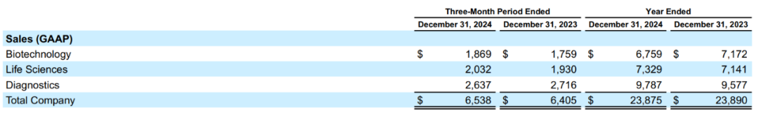 2024年,丹纳赫总营收238.75亿美元,与去年持平。诊断业务、生命科学略优于预期。 诊断业务是丹纳赫最大的业务部门,占比40.1%,全年营收97.87亿美元,同比+2%,主要由高级染色和数字病理学推动。