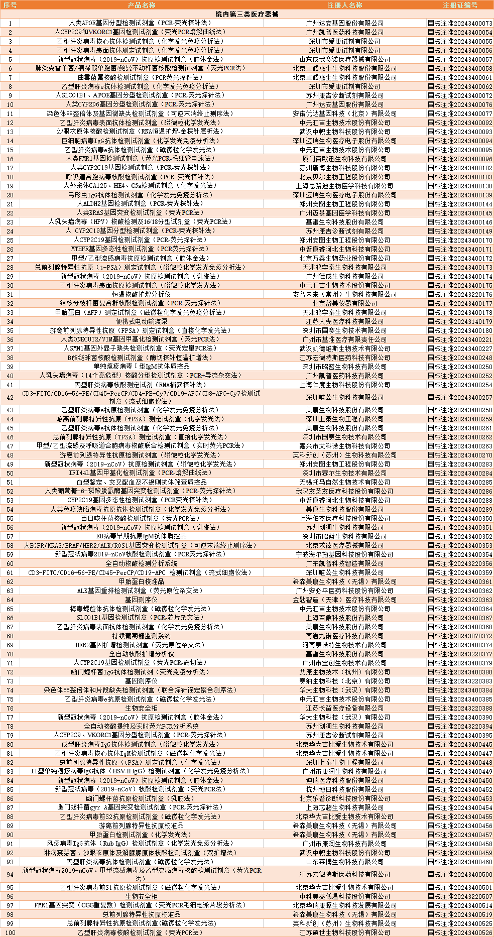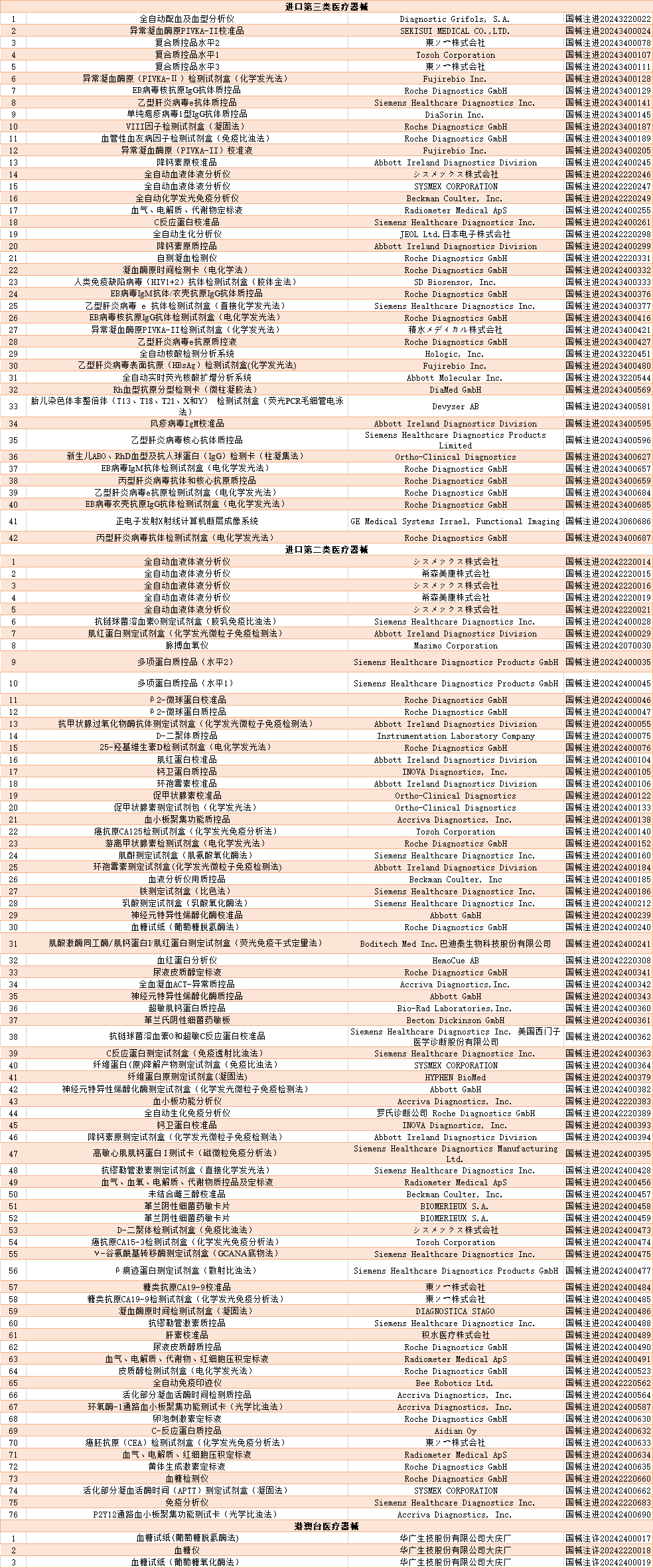 截至2024年12月,国家药品监督管理局共批准注册IVD产品650个。其中,境内第三类IVD产品529个,进口第三类IVD产品42个,进口第二类IVD产品76个,港澳台IVD产品3个。