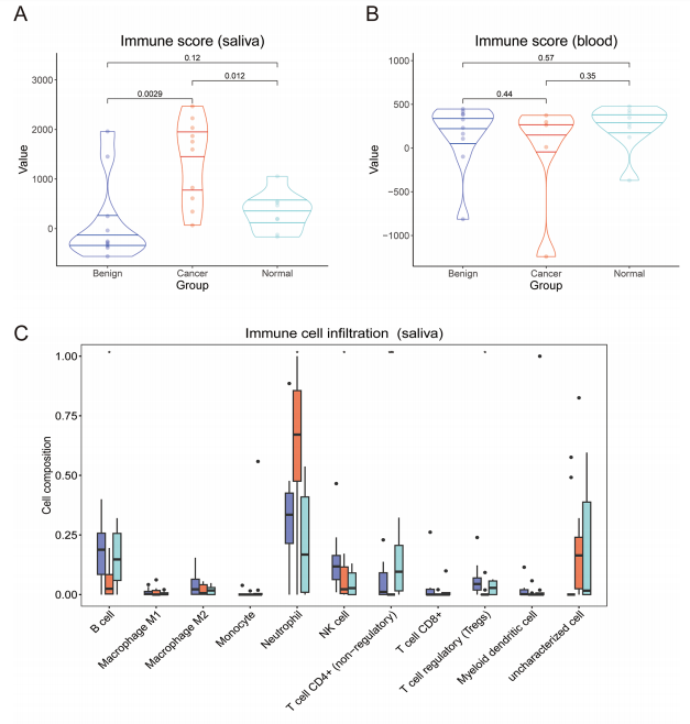 唾液样本中不同组别免疫浸润的差异。