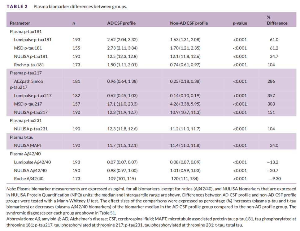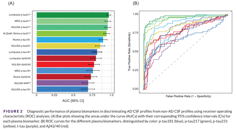 t-tau 和 Aβ42/40 测定相比,血浆 p-tau 生物标志物在检测 Aβ 病理方面具有更高的诊断性能和更大的效应量。其中,血浆 p-tau217 的表现始终优于其他血浆,显示出优异的曲线下面积。此外,p-tau217 在血浆和 CSF 水平之间显示出最强的相关性,强调了其作为 CSF 生物标志物的可靠替代物的潜力。