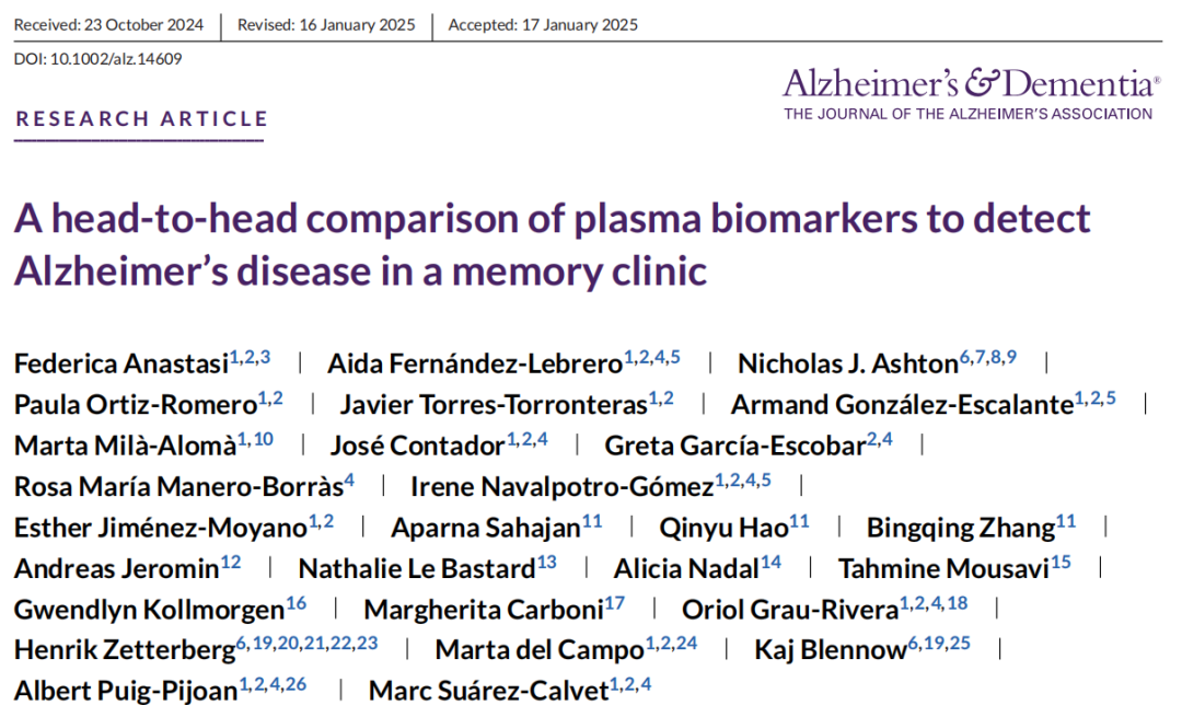 原文下载:A head‐to‐head comparison of plasma biomarkers to detect Alzheimer's disease in a memory clinic.pdf