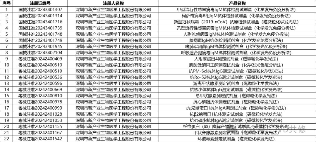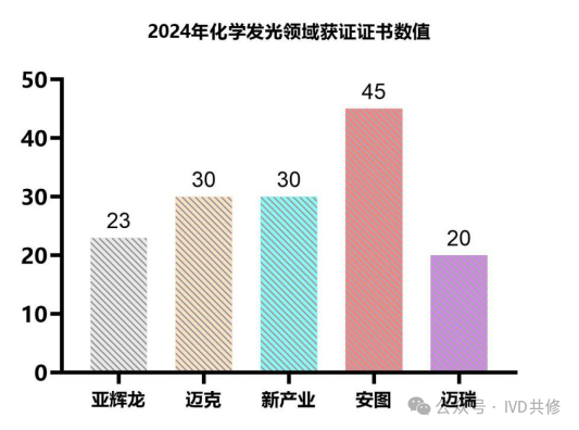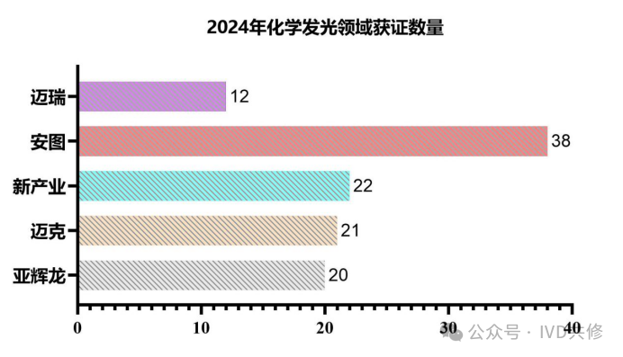 截至2024年12月31日,NMPA化学发光领域注册数据显示:安图生物以38项获证位居榜首,主要集中在肿瘤标志物、自身免疫以及呼吸道病原体标志物;新产业(22项)与迈克生物(21项)紧随其后,新产业重点布局呼吸道与自身免疫,迈克主要布局Torch与自身免疫;亚辉龙(20项)在自免领域表现突出;迈瑞医疗获证13项,主要集中在Torch从上述数据不难看出,未来自免领域的竞争将会加剧,而呼吸道病原体标志物作为热点,各厂家都在积极部署。