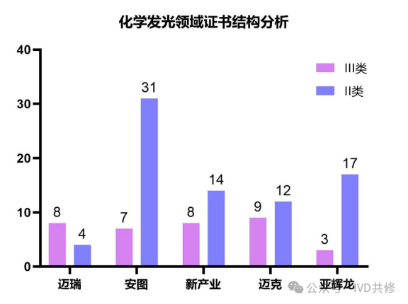单纯的数量对比可能产生误判,需结合证书结构进行多维分析。2024年安图获得III类化学发光证书7项,II类证书31项,其II类证书占比81%;新产业获得III类证书8项,II类化学发光证书14项;迈克获得III类化学发光证书9项,II类证书12项;亚辉龙获得III类化学发光证书3项,II类证书17项;迈瑞获得III类证书8项,II类化学发光证书4项,III类证书占比67%。行业呈现“高端突破+中低端放量”双轨并行态势。