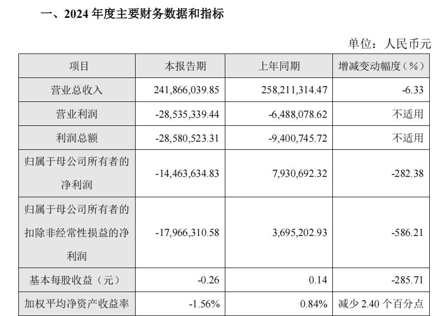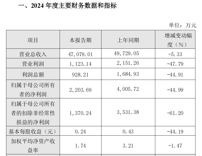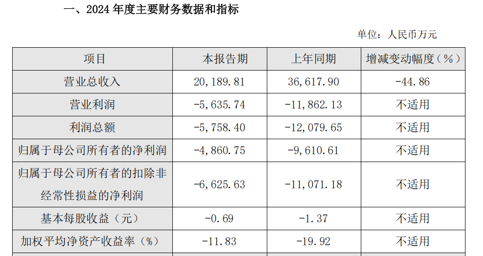 • 2024年度,公司实现营业收入20,189.81万元,较上年同期下降44.86%