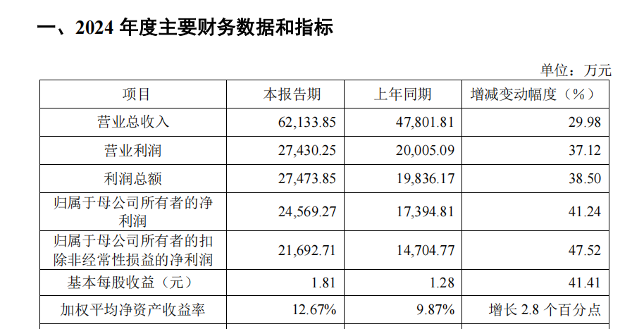 • 实现归属于母公司所有者的净利润 24,569.27 万元,同比增长 41.24%