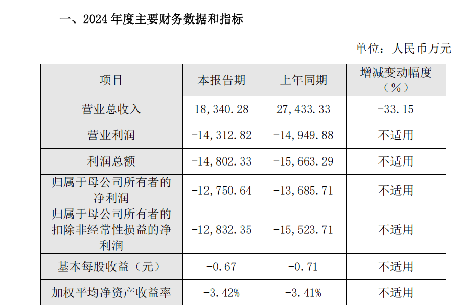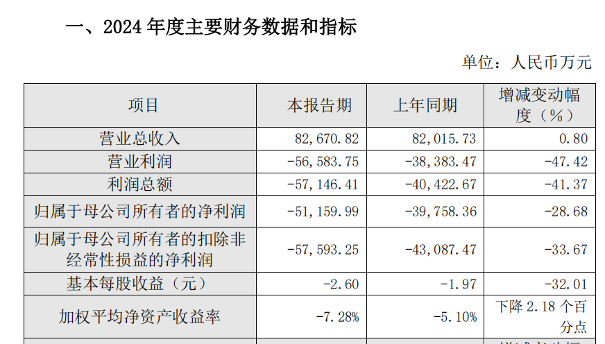 • 归属于母公司所有者的扣除非经常性损益的净利润-57,593.25 万元,比上年度下降 33.67%;