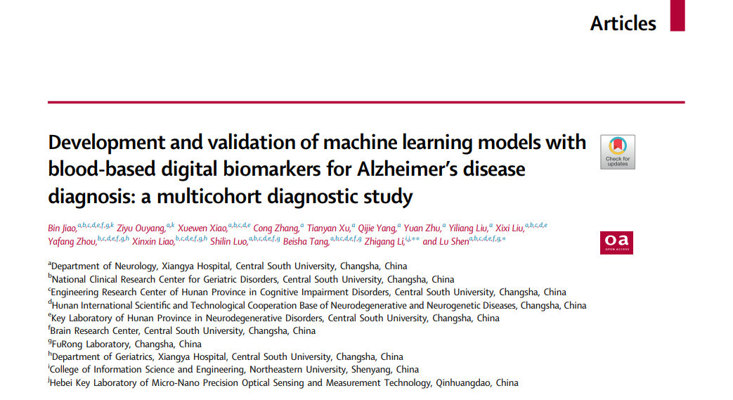 近日,中南大学湘雅医院神经内科、国家老年疾病临床医学研究中心(湘雅医院)沈璐教授团队在柳叶刀子刊《eClinicalmedicine》(IF=9.6(近3年平均13.9))以论著形式在线发表了题为“Development and validation of machine learning models with blood-based digital biomarkers for Alzheimer’s disease diagnosis: a multicohort diagnostic study(基于血液数字生物标志物的机器学习模型在阿尔茨海默病诊断中的开发与验证:多队列诊断研究)”的原创性研究成果。该研究创新性构建基于衰减全反射傅立叶变换红外光谱(ATR-FTIR)的血浆数字化诊断模型,首次揭示血液光谱特征与阿尔茨海默病(AD)病理机制的内在关联,为AD的早期筛查和诊断提供有价值的支持。中南大学湘雅医院神经内科沈璐教授和东北大学信息科学与工程学院李志刚副教授为论文共同通讯作者,中南大学湘雅医院神经内科焦彬副研究员、欧阳紫淯为该论文第一作者,中南大学湘雅医院为第一及通讯作者单位。AD临床诊断主要依赖脑脊液检测及分子影像技术,但存在侵入性操作风险高、费用昂贵等局限性。针对这一全球性难题,研究团队开创性提出"光谱组学"研究范式,通过红外光谱与生物分子的相互作用,同步捕获蛋白质构象、脂质代谢、核酸结构等多维分子信息,生成具有独特诊断价值的"数字生物指纹"。相较于传统单一生物标志物检测,该技术可全景式解析AD病理生理过程中复杂的分子网络变化,为机器学习模型提供高内涵数据支撑,破解AI模型临床应用的决策解释性与透明度瓶颈。联合东北大学交叉学科团队,研究共纳入中心收集的1324例病例对照的血浆样本,通过完成衰减全反射傅立叶变换红外光谱学数据采集,利用随机森林分类器与特征选择程序对海量光谱数据进行深度挖掘,成功筛选出AD特异性数字生物标志物组合。基于机器学习构建的数字化诊断模型(MLDB)展现出卓越性能:在AD与健康人群(HC)的鉴别中取得0.92的曲线下面积(AUC),灵敏度与特异性分别达88.2%和84.1%;对轻度认知障碍(MCI)患者的识别能力达AUC 0.89;在鉴别路易体痴呆(DLB)、额颞叶痴呆(FTD)及进行性核上性麻痹(PSP)等神经退行性疾病时,AUC分别达到0.83、0.80和0.93,展现出强大的临床鉴别诊断能力。通过单分子免疫检测技术(SMID)验证发现,血浆p-tau217、GFAP等经典生物标志物与特定光谱特征存在显著负相关,为模型赋予分子病理学解释。该数字化诊断模型展现出三重临床优势:在AD诊断效能上显著优于传统方法;可精准识别MCI患者;在鉴别DLB、FTD及PSP等其他神经退行性疾病方面表现突出。光谱组学技术仅需微量血液样本即可实现全景式分子表征,兼具无创、低成本、高可及性等优势,为AD早筛早诊体系的建立提供创新解决方案。全文链接: https://www.sciencedirect.com/science/article/pii/S2589537025000744