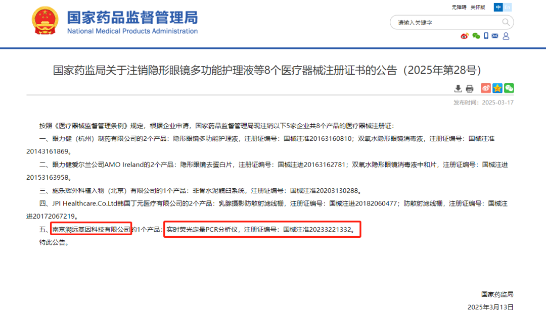 根据国家药监局官网查询显示,此次溯远基因申请注销的产品为其目前唯一一个获得临床三类注册的荧光定量PCR仪。于2023年9月获得注册证。这也是溯远基因唯一一个三类证,注销着实有些可惜。 南京溯远基因科技有限公司成立于 2017 年 9 月,是一家专注于高端科学仪器的自主研究开发、制造的创新驱动型高科技企业。溯远基因研发的基于 Sanger 测序平台的8色基因分析仪,打破了国外企业在这一领域的长期垄断格局,实现了中国Sanger测序仪领域里程碑式的突破。溯远基因将进一步打造基因分析仪“仪器、通用试剂、耗材、解决方案”的全产业链开放式平台,大力推动中国 Sanger 测序产业的进口替代到超越的发展进程。 据IVD从业者网统计,目前共有131家企业,拿到了199款PCR仪器的注册证,数量非常庞大。 参考资料:国家药监局 |