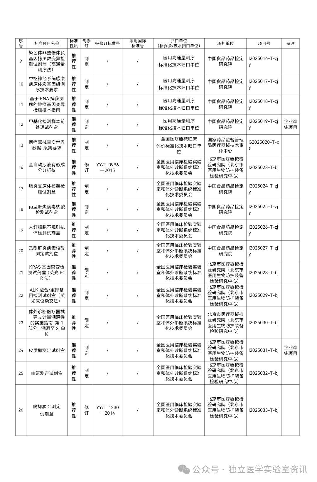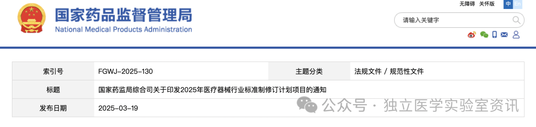 行业标准 国家药监局综合司关于印发2025年医疗器械行业标准制修订计划项目的通知北京、天津、辽宁、上海、江苏、浙江、山东、湖北、广东省(市)药监局,中检院(器械标管中心)、器审中心,北京大学口腔医学院口腔医疗器械检测中心,机械工业仪器仪表综合技术经济研究所: 为贯彻《国务院办公厅关于全面深化药品医疗器械监管改革 促进医药产业高质量发展的意见》,落实《“十四五”国家药品安全及促进高质量发展规划》有关要求,按照国家药监局医疗器械行业标准制修订工作部署,现将2025年医疗器械行业标准制修订计划项目印发给你们,并就有关要求通知如下: 一、各相关省(市)药监局要高度重视,认真组织本行政区域标准承担单位开展标准制修订工作,加强监督管理,确保按要求完成各项工作任务。 二、国家药监局器械标管中心要认真组织协调各医疗器械标准化(分)技术委员会、工作组及技术归口单位,严格按照《医疗器械标准制修订工作管理规范》开展标准制修订工作,加强业务管理和指导,保证标准质量和水平。 三、承担标准制修订任务的医疗器械标准化(分)技术委员会、工作组及技术归口单位要做好标准的组织起草、验证、征求意见和技术审查等工作,要广泛调研、深入研究,确保标准技术内容的科学性、合理性、适用性以及与相关政策要求的符合性。 附件 附件: 1.2025年医疗器械强制性行业标准制修订计划项目 2.2025年医疗器械推荐性行业标准制修订计划项目 其中2025年医疗器械推荐性行业标准制修订计划项目,涉及NGS等体外诊断项目,部分推荐性标准制定,为企业牵头项目。 以下节选体外诊断相关项目: 资料来源:国家药监局 |