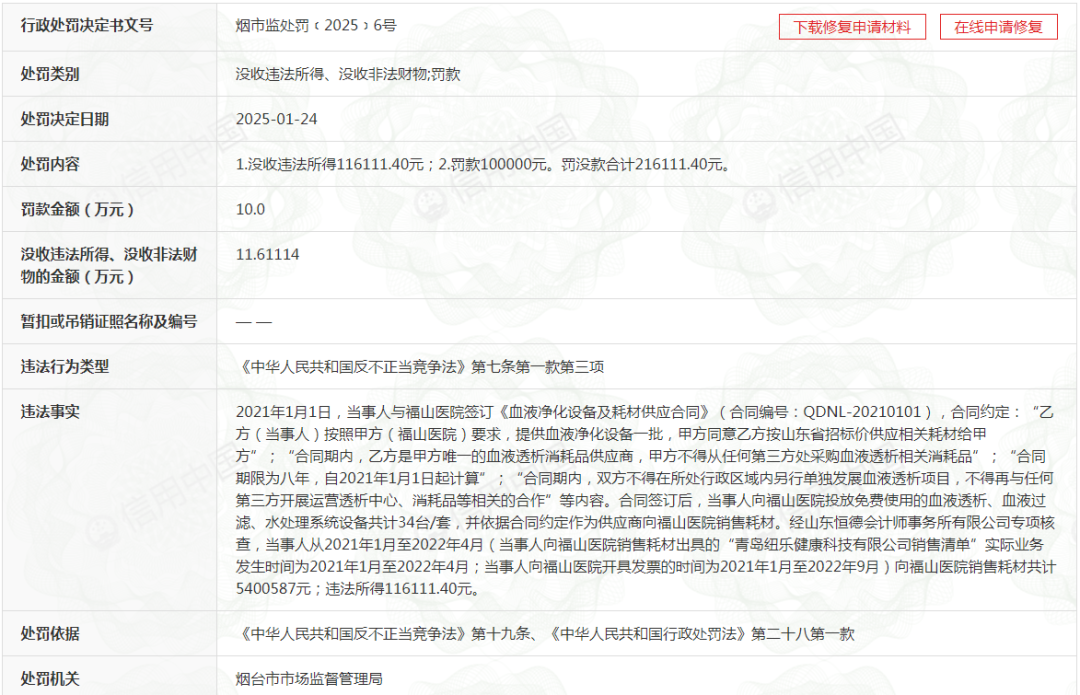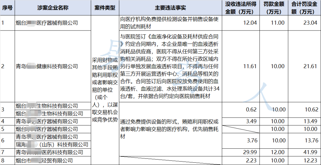 近日,烟台市市监局集中查处8起医药行业贿赂案,共有9家器械、IVD企业,总计罚没146余万元。 9家械企均涉“采用财物或其他手段贿赂利用职权或者影响交易的单位(或个人),以谋取交易机会或竞争优势”;其中8家的处罚文书指出其存在“向医疗机构免费提供检测设备,销售设备使用的试剂耗材”的行为。 今年1月14日,国家市场监督管理部门发布《医药企业防范商业贿赂风险合规指引》,其中第七节 医疗设备无偿投放商业贿赂风险明确“禁止医药企业通过无偿投放医疗设备,与医疗卫生机构约定采购耗材、配套设备、药品和服务等的最低数量或者金额,或者约定采购价格明显高于市场价格,不当获取交易机会及竞争优势。” 而青岛某健康科技有限公司则与医院签订合同约定“本企业是唯一的血液透析消耗品供应商,医院不得从任何第三方处采购血液透析相关消耗品;合同期内,双方不得在所处行政区域内另行单独发展血液透析项目,不得再与任何第三方开展运营透析中心、消耗品等相关的合作”等内容。 另,青岛某医疗器械有限公司是唯一一家被烟台市监局处罚两次的企业,涉及烟市监处罚〔2025〕4号、烟市监处罚〔2024〕64号两个案件。 9家企业均被依据《中华人民共和国反不正当竞争法》第十九条“经营者违反本法第七条规定贿赂他人的,由监督检查部门没收违法所得,处十万元以上三百万元以下的罚款。情节严重的,吊销营业执照”等规定,处以罚款。 图片来源 | veer、ibaotu |