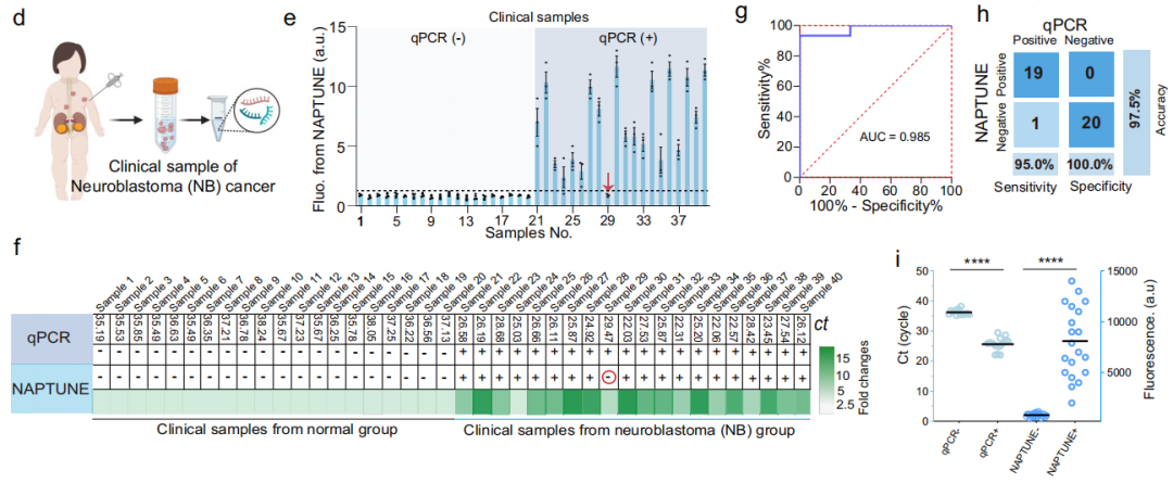 作者使用NAPTUNE测量了临床样本中miR-21的表达水平。NAPTUNE检测显示出与qRT-PCR方法显著的一致性,灵敏度为95.0%,特异性为100.0%,阴性准确性为97.5%(图e-g)。与qRT-PCR相比,NAPTUNE利用荧光读取器导至阴性阳性样本显示出了更明显的差异。阴性和阳性结果产生19倍的荧光差值变化,显著提高了区分阴性和阳性结果的便利性(图i)。