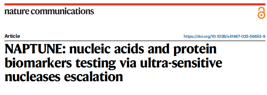 近日,杂志Nature communications上发表了一篇题为“NAPTUNE: nucleic acids and protein biomarkers testing via ultra-sensitive nucleases escalation”的文章。作者开发了NAPTUNE平台,无需放大步骤,利用APE1和PfAgo内切酶的协同酶活性,在45min内实现了单管反应对aM水平核酸的超灵敏检测。此外,使用NAPTUNE平台还可对低至1.25ng/ml的FEN1进行高灵敏度和选择性检测。