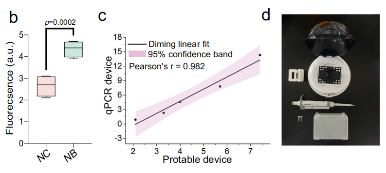 作者设计了一个小而轻的装置(50g),将NAPTUNE转化为护理点(POC)检测分析,可通过手机显示测试结果。基于智能手机的POC设备检测临床样本中不同水平的miR-21的能力,与qRT-PCR方法一致(图b)。