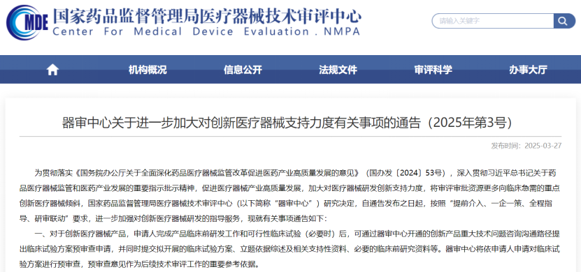 为贯彻落实《国务院办公厅关于全面深化药品医疗器械监管改革促进医药产业高质量发展的意见》(国办发〔2024〕53号),深入贯彻习近平总书记关于药品医疗器械监管和医药产业发展的重要指示批示精神,促进医疗器械产业高质量发展,加大对医疗器械研发创新支持力度,将审评审批资源更多向临床急需的重点创新医疗器械倾斜,2025年3月27日国家药品监督管理局医疗器械技术审评中心发布通告,按照“提前介入、一企一策、全程指导、研审联动”要求,进一步加强对创新医疗器械研发的指导服务。