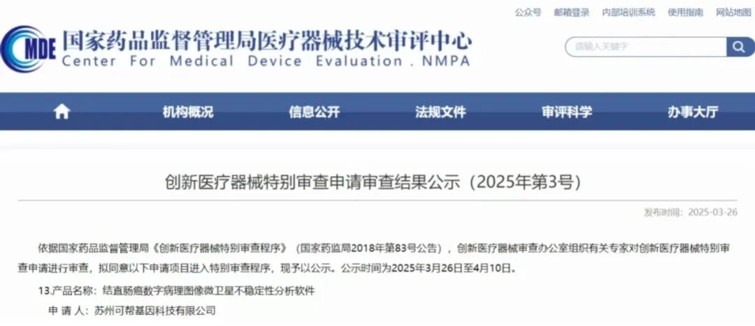 2025年3月26日,国家药品监督管理局(NMPA)医疗器械技术审评中心发布公示,可帮基因「结直肠癌数字病理图像微卫星不稳定性分析软件」通过创新医疗器械特别审查申请,进入创新医疗器械特别审查程序。这是中国首个被纳入创新医疗器械的数字病理人工智能大模型产品,标志着数字病理AI大模型应用于肿瘤标志物辅助诊断实现重要突破,也意味着数字病理AI大模型作为医疗器械产品进入实质性落地阶段。