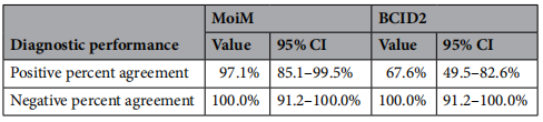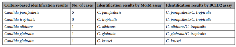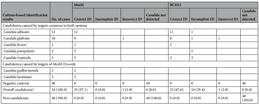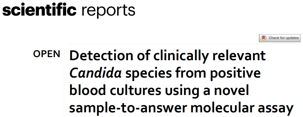近日,杂志Scientific reports上发表了一篇题为“Detection of clinically relevant Candida species from positive blood cultures using a novel sample-to-answer molecular assay”的文章。MoiM Dx Candida 9-plex assay(MoiM)是一种用于鉴定临床相关的念珠菌种类从样品到答案的分子检测试剂盒。本研究旨在评估MoiM对阳性血培养样本的诊断性能,并将结果与Biofire血培养鉴定panel(BCID2)的结果进行比较。结果显示,MoiM检测的PPA为97.1%,NPA为100.0%,比BCID2(PPA为67.6% ,NPA为100.0%)相当或更优。 图片来源:Scientific reports 主要内容 血培养是念珠菌血症的金标准,但需时5天或更长时间,且敏感性有限,约为50%。传统的qPCR检测侵袭性念珠菌血症,需要单独的DNA提取步骤,通常需要4个多小时才能完成。最近的进展已经无需真菌培养,并且DNA扩增可直接从临床样品中进行。MoiM被开发为一种样品到答案的分子检测试剂盒,用于鉴定临床相关的念珠菌种类。该平台在90分钟内实现了从DNA提取到PCR分析的整个过程的自动化,从而最大限度地减少了诊断过程中的人为错误。此外,其占地面积小,完全自动化的工作流程允许集成到各种临床实验室环境中。该实验针对9种不同的念珠菌,包括白色念珠菌、耳念珠菌、近平滑念珠菌、光滑念珠菌、季也蒙念珠菌、热带念珠菌、克柔念珠菌、葡萄牙棒孢酵母和都柏林假丝酵母菌。本研究旨在评估MoiM对阳性血培养样本的诊断性能,并将结果与Biofire血培养鉴定panel(BCID2)的结果进行比较。 作者共选择了39例念珠菌血症和40例非念珠菌血症血培养样本进行评价。这些冷冻样品被解冻,并复温达到室温,然后通过MoiM和BCID2同时进行检测。下表总结了MoiM实验和BCID2面板与培养结果的鉴定结果。有34例的念珠菌血症病原体为两种检测方法的共同靶标,其中33例(97.1%)通过MoiM试验被正确识别,而1株光滑念珠菌被错误地识别为克柔念珠菌。相比之下,BCID2正确识别了23个(67.6%)病例,10个(29.4%)不完整识别,1个(2.9%)被错误识别。MoiM检测对念珠菌血症患者的正确识别率显著高于BCID2。MoiM法对2例季也蒙念珠菌和3例葡萄牙棒孢酵母也进行了正确鉴定,这两个种属在BCID2靶标范围之外。在40例非念珠菌血症例中均未观察到假阳性结果。 MoiM和BCID2方法检测念珠菌血症的对比结果。 图片来源:Scientific reports 总体而言,与基于培养的结果相比,MoiM检测的PPA为97.1%,NPA为100.0% 。BCID2的PPA为67.6% ,NPA为100.0%(如下表)。 MoiM和BCID2方法的检测性能。图片来源:Scientific reports 下表总结了MoiM、BCID2分析和基于培养的方法之间不一致的鉴定结果。10例念珠菌种类与培养鉴定(MALDI-TOF MS)和MoiM试验结果一致。然而,BCID2的鉴定不完整,在所有10例中都鉴定出了正确和错误的物种。另外,一个通过培养鉴定鉴定为光滑念珠菌的病例被MoiM和BCID2方法都错误地鉴定为克柔念珠菌,这揭示了两种系统和培养方法之间的不一致结果。 几种方法鉴定结果不一致的总结。图片来源:Scientific reports 本研究中,作者观察到67.6%和29.4%的念珠菌血症病例分别被BCID2方法正确或不完全识别,PPA为67.6% ,NPA为100.0%。而MoiM检测的PPA为97.1%,NPA为100.0% 。MoiM检测对念珠菌血症患者的正确识别率显著高于BCID2。MoiM法对2例季也蒙念珠菌和3例葡萄牙棒孢酵母也进行了正确鉴定,这两个种属不能由BCID2方法靶向。BCID2经常报告多个物种,这表明这种方法可能难以区分密切相关的物种,或者可能报告只有单一物种存在的混合感染。相比之下,MoiM试验在这些情况下通过一致地识别单一物种显示出更大的特异性。 这项研究有几个局限性。此研究受到单中心设计和分离株数量有限的限制,不能完全评估所有的念珠菌菌种。进一步的研究利用大量的临床样本将是必要的。MoiM测定的LOD范围与BCID2相当,对于血液样本的应用还需要进一步改进。 |