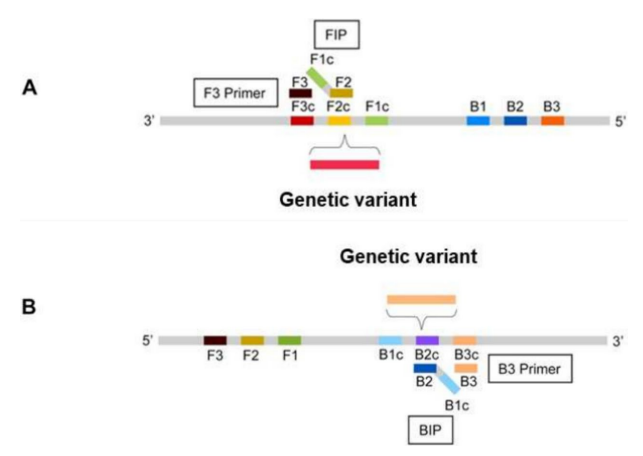 作者开发的新方法依赖于分别对BIP和FIP引物的F2或B2片段进行修饰。在F2或B2引物的3′端修改2 ~ 7个核苷酸,使序列与突变后的核苷酸序列相同或相反并互补。这样在存在野生型核酸模板的情况下,F2或B2引物的3′端与模板分离,防止扩增,只特异性捕获突变。其余LAMP反应引物,即F3, B3, BIP和可选的LF和/或LB环引物,根据典型的LAMP工作流程设计。