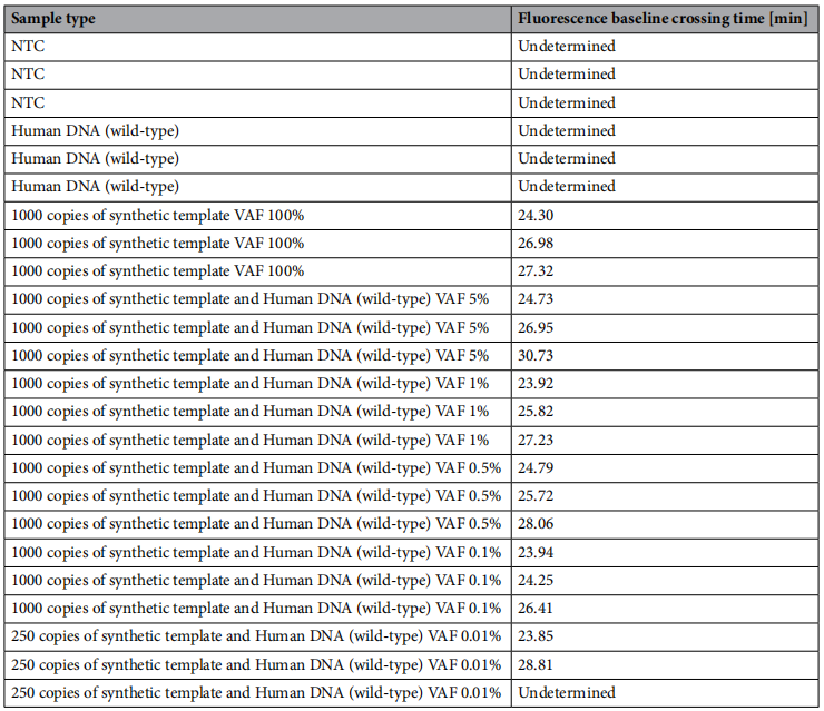 肿瘤样本通常包含突变细胞和健康细胞的混合物,作者评估了设计的引物在在野生型DNA存在时对突变DNA的特异性。实验采用变异等位基因频率(VAF)分别为0.01%、0.1%、0.5%、1%、5%和100%的野生型和突变DNA混合物。检测每个样品的荧光信号所需的时间见下表。结果显示,当VAF为0.1%,0.5%,1%,5%和100%时,可在所有重复的实验样品中观察到信号;当VAF为0.01%时,在三次重复中有两次观察到产物。在仅含有野生型DNA和NTC的样品中未观察到信号。结果证实,在VAF低至0.1%的DNA中,所设计的引物对突变DNA也具有特异性。