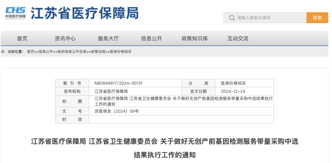 样本外送也开始集采了! 4月9日,浙江省医保局发布《关于进一步加强医药集中带量采购全流程管理的通知》(下称《通知》。 重点包括: 1、加强集中带量采购与DRG支付改革协同 做好集采结余留用政策与支付方式改革激励约束机制的衔接,综合体现对医疗机构采购和使用中选药品和耗材的正向激励,建立DRG分组与集采品种价格联动的动态调整机制,形成改革闭环。各级医保部门要推进DRG支付改革选代升级,动态调整点数,将集采报量准确率、约定采购量完成率(如中选产品使用占比)等纳入DRG绩效考核体系,与医保基金拔付等挂钩。 2、对集采执行情况开展动态监测 健全省、市、县三级采购监测体系,依托智慧医保系统,提升对集采执行情况的信息化监测能力,动态监测每个采购品种、每家医疗机构的采购进度、采购量占比、资金结算、可替代品种采购等情况,重点对中选产品采购进度低于序时进度、非中选产品采购量占比过高、供应配送出现异常、资金结算不及时的通过系统自动示警,做到提前发现、主动预警,并通过提醒、约谈、告诫等方式督促相关责任主体限期整改。 3、鼓励健全多方联动采购机制 鼓励医疗机构发挥药械采购主体作用,允许在省平台挂网价格基础上与医药企业开展议价,并严格执行“零差率”销售。推动未纳入集中带量采购范围的药品和医用耗材,以专科医院联合采购、医疗联合体采购、自愿组成采购联盟采购等形式开展组团采购,指导省级医疗机构和杭州市、宁波市先行开展试点。探索开展无创产前基因检测等第三方检验检测服务集中带量采购。 这是继江苏以后,又一省开始探索第三方检测服务集采模式。 江苏基因检测服务集采已执行 2024年12月,江苏医保局发布《江苏省医疗保障局江苏省卫生健康委员会 关于做好无创产前基因检测服务带量采购中选结果执行工作的通知》,于2025年1月1日起执行本次无创产前基因检测服务带量采购中选结果,执行期暂定为2年。 本次集采共有江苏省内17家产前诊断医疗机构和10家第三方医学检验机构参与并中选,实现无创产前基因检测费用降低约50%。 集采前,江苏无创产前基因检测项目收费为每人份1200元(含基因检测服务费用和医疗机构出具诊断报告费用)。集采后,无创产前基因检测服务的中选价格为每人份370—500元。 执行方面,根据《通知》, 本次无创产前基因检测服务带量采购中选结果予以单独收费,收费价格包含样本采集、样本转运、样本处理、文库构建、上机检测、校标质控等检测环节所有服务和耗材费用。 具体价格如下: 无创产前基因检测按照“检测服务+诊断服务”方式收取费用,诊断服务最高政府指导价为60元/次,检测服务按集采中选结果执行,单次收费最高不超过560元。医疗机构出具诊断报告时,不得再加收诊察费。省内产前诊断机构以及符合卫生健康部门规定与产前诊断机构建立合作机制的产前筛查机构,应规范开展无创产前基因检测服务并收取费用。 此外,将无创产前基因检测的检测服务和诊断服务暂纳入医保乙类支付范围,实行门诊按项目单独支付,医保基金支付上限为430元(含检测服务和诊断服务费用),参保人员个人先行自付比例不高于10%,超过支付上限部分纳入个人自付统计口径。职工医保和居民医保除先行自付部分外,统筹基金分别按80%和70%予以支付。 为什么从NIPT开始? 基因检测项目自有其特殊性。 无创基因检测试剂需与特定型号的测序仪配套使用,即“专机专用”,而后者价格动辄上百万元,医院难以配齐所有测序仪。如以检测试剂为集采对象,未中选试剂对应测序仪的医疗机构将无法开展检测。 为破解这一难题,江苏此次集采由传统的“产品集采”转变为“服务集采”,以基因检测服务为集采对象,开展检测的医疗机构和第三方医学检验机构作为参与主体自主确定检测设备和试剂,降低检测环节成本,最终通过竞争降低检测服务价格。 基因检测的主要场景包括传染病诊断、生殖健康、肿瘤早筛、伴随诊断及消费级基因。 无创产前基因检测服务是预防新生儿出生缺陷的一项检查,可以筛查唐氏综合征(T21)、爱德华综合征(T18)、帕套综合征(T13)三大染色体疾病。与传统的穿刺等筛查方法相比,无创产前基因检测服务有无创伤性、检出率高、检测周期短等优点。 伴随集采扩围,无创产前基因检测市场也面临降价。 此前,河北省卫健委曾对NIPT检测服务统一组织政府采购,按照全省2024年-2025年检测总量不超过80万例,对检测服务单价进行竞争性磋商,项目预算28160万元。最终中标价格为345元。 而在江苏首开无创产前基因检测集采后,预计其他地区也可能会有新动作。 市场端,华大基因和贝瑞基因较早入局无创产前基因检测(NIPT)领域,约占70%左右市场份额。国内还有安诺优达、达安基因、迪安诊断、贝康医疗、博奥生物等企业布局NIPT。 对于NIPT集采,华大基因此前表示,江苏的NIPT集采具有示范作用,预计将成为未来NIPT推广的核心渠道和模式。华大基因表示,通过政府集采,公司将进一步加大和巩固在生育健康领域的核心竞争力。 据动脉网数据,NIPT在高龄产妇群体中渗透率约为65%,在非高龄产妇中的渗透率约为35%,整体平均渗透率约为40%。后续市场规模扩张的动力主要来自于渗透率的提高。 长期来看,NIPT渗透率有望提升。不过眼下,NIPT市场首先需要经受一波降价考验