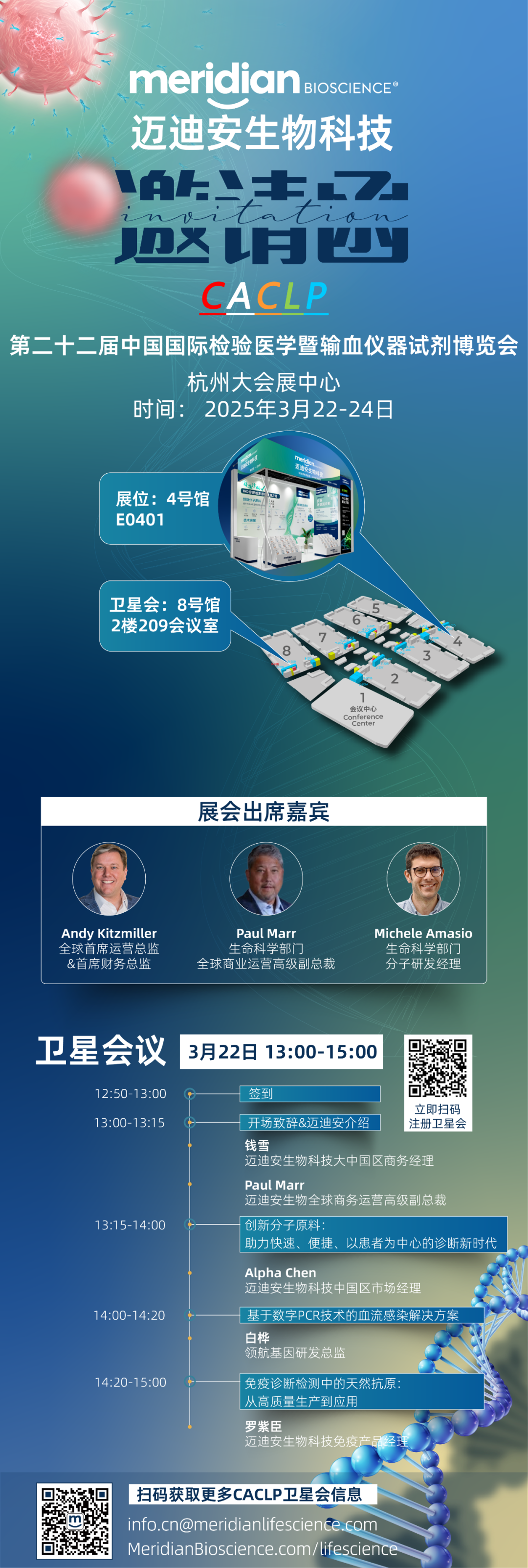 Why Meridian? CACLP 相聚共讨 在本次CACLP展会上,Meridian迈迪安将全方位展示我们在分子诊断与蛋白质制造领域的专业定制服务。您将有机会亲身体验我们创新的无甘油酶技术、常温稳定检测解决方案以及非动物源蛋白产品,深入了解这些前沿技术如何为您的业务赋能,助力您在激烈的市场竞争中脱颖而出。 精选专题 北京迈迪安生物科技有限公司是Meridian Bioscience在中国设立的全资子公司。Meridian BioScience (以下简称:迈迪安)是一家全球领先的生物诊断公司,总部设立在美国,距今已有45年的历史。迈迪安公司分为诊断和生命科学两个部分,在中国地区的主营业务是生命科学产品,包括各种分子和免疫诊断检测的关键原料,如抗原抗体、免疫阻断剂、PCR和LAMP反应的聚合酶和优化的预混液、核苷酸等,为人体、动物、农业、环境及食品安全等各种检测提供全面的解决方案。45年来,迈迪安已经成为全球各领域诊断企业的首选原料供应商! |