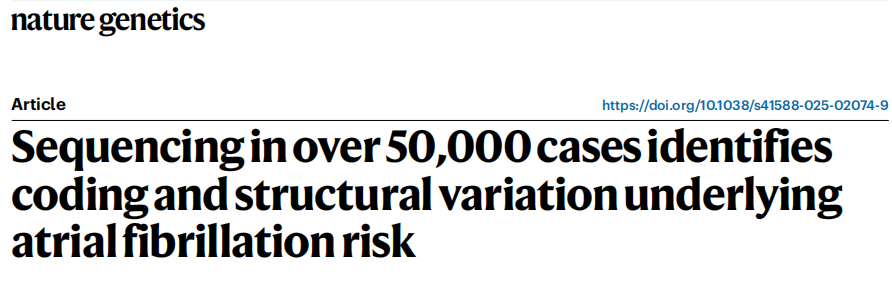近日,杂志Nature genetics上发表了一篇题为“Sequencing in over 50,000 cases identifies coding and structural variation underlying atrial fibrillation risk”的文章。该研究利用了迄今为止最大规模的这种复杂疾病的测序数据,并评估罕见编码遗传变异对AF风险的作用。结果发现AF与MYBPC3、LMNA、PKP2、FAM189A2和KDM5B基因之间存在关联。AF与罕见结构变异研究中,发现CTNNA3缺失和GATA4重复与AF存在关联。干细胞源性心房心肌细胞中KDM5B的敲除可导至动作电位持续时间缩短和广泛的转录组失调。此研究结果强调了罕见的编码和结构变异对房颤的贡献,包括房颤和心肌病之间的遗传联系,并加深了对这种常见心律失常的罕见变异结构的理解。 图片来源:Nature genetics 主要内容 研究揭示新的罕见变异与房颤相关 作者首先进行了基于外显子组的基因分析,测试了AF与功能丧失(LOF)和有害错义(pDM)突变之间的关系。正如预期的那样,TTN的相关性最强,证实了该基因在房颤发病中的重要作用。此外还发现了四个与房颤相关的新基因(下图a),包括MYBPC3(编码肌球蛋白结合蛋白c3),LMNA(编码层粘连蛋白A/C),PKP2(一种罕见变异强烈促进心律失常的基因),KDM5B(赖氨酸去甲基酶5B)。 测序识别了与房颤相关的新型罕见编码变异。 图片来源:Nature genetics 识别与房颤相关的错义突变 作者对AF的低频和罕见编码变异进行了单变关联测试,发现了5个与AF显著相关的低频或罕见编码变异(下图b)。这些关联包括3个先前报道的错义变异(MYZAP、RPL3L和SH3PXD2A)和两个新的罕见的错义突变关联,FAM189A2(p.Leu105Arg)和ZFC3H1( p.Asp280Tyr),与AF风险增加相关。其中,FAM189A2(p.Leu105Arg)在重复数据集的中得到了验证。 测序识别了与房颤相关的新型罕见编码变异。 图片来源:Nature genetics 罕见的结构变异与房颤有关 作者分析了对照和AF病例预测高影响结构变异。结果显示,CTNNA3的罕见缺失与AF风险增加相关(图a),且在重复数据集的中得到了验证。罕见变异CTNNA3曾被报道在有限病例中致心律失常性右室心肌病,,CTNNA3基因敲除小鼠发生扩张性心肌病。 8号染色体基因组区域内基因的罕见重复与对AF的保护有关。该区域包括编码一个重要心脏转录因子的GATA4,以及其他几个基因(FAM167A,BLK,NEIL2,FDFTI,CTSB)。增加GATA4剂量可能通过改变心房中调节基因网络的转录因子平衡来预防房颤,但这种保护的潜在机制还需要进一步研究。 CTNNA3和GATA4的大结构变异与AF有关。 图片来源:Nature genetics KDM5B缺失导至心房细胞的转录组改变 作者敲除KDM5B进行RNA测序,并进行差异表达分析,以表征心肌细胞中KDM5B调控的基因和分子途径(下图d)。结果确定了619个基因在KDM5B基因编辑后下调,530个基因上调。在显著下调的分子途径中,包括核小体组装、染色质修饰酶、心脏发育和缺氧(图e)。上调的信号通路包括p53信号、离子通道活性、突触信号、心脏传导和心房心肌细胞动作电位(图f)。p53信号的上调过程与心肌细胞死亡和心力衰竭水平升高有关。几个先前与心律失常相关的离子通道和钙结合蛋白上调,包括SCN5A、SCNN1D、SLC12A4和PIEZO1。这些结果表明,KDM5B表达的降低会导至心肌细胞发生深刻的转录和生理变化,这不仅可能影响动作电位,还可能影响细胞存活和代谢。 KDM5B缺失导至心房细胞的转录组改变。 图片来源:Nature genetics KDM5B缺失导至心房细胞动作电位缩短 作者使用KDM5B敲除方法,评估KDM5B在心房心肌细胞中的电生理作用。结果显示,敲除KDM5B,可显著缩短心房心肌细胞动作电位持续时间(如下图),与RNA-seq数据的发现一致,即钾通道的转录水平增加,包括KCNJ3和KCNIP2,引起心房复极化驱动增强。综上所述,此功能研究强调了KDM5B在心房心肌细胞转录编程和电生理中的重要作用。 KDM5B缺失导至心房细胞动作电位缩短。 图片来源:Nature genetics 总结与讨论 该研究利用了迄今为止最大规模的这种复杂疾病的测序数据,并评估罕见编码遗传变异对AF风险的作用。结果发现AF与MYBPC3、LMNA、PKP2、FAM189A2和KDM5B基因之间存在关联。AF与罕见结构变异研究中,发现CTNNA3缺失和GATA4重复与AF存在关联。干细胞源性心房心肌细胞中KDM5B的敲除可导至动作电位持续时间缩短和广泛的转录组失调。此研究结果强调了罕见的编码和结构变异对房颤的贡献,包括房颤和心肌病之间的遗传联系,并扩大了对这种常见心律失常的罕见变异结构的理解。 |