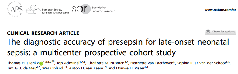 近日,杂志Pediatric Research上发表了一篇题为“The diagnostic accuracy of presepsin for late-onset neonatal sepsis: a multicenter prospective cohort study”的文章。作者开展了首个前瞻性观察队列研究,研究了presepsin对迟发性新生儿脓毒症的诊断准确性。结果发现,Presepsin作为单一生物标志物,在疑似LONS的婴儿中作为排除LONS的生物标志物,其准确性似乎不足。未来有必要进行更大规模的研究来验证此发现,并调查presepsin与其他生物标志物联合作为诊断工具的临床影响,以促进有关抗生素启动的决策。