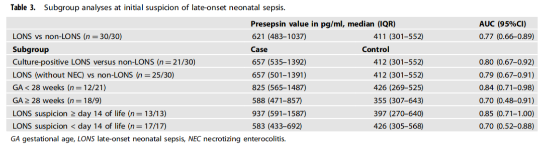 作者假设,Presepsin可能是诊断LONS的合适生物标志物。Presepsin是细胞表面受体CD14的一个片段,可以结合细菌配体如脂多糖(LPS)。在与LPS结合后,细胞脱落CD14,产生一种小的可溶性肽,称为可溶性CD14亚型(sCD14-ST)或Presepsin。与其他生物标志物相比,在细菌感染开始后,Presepsin血浆浓度增加得更快,并且可以进行护理点分析。先前的研究将无脓毒症婴儿与LONS病例进行了比较,结果显示Presepsin对LONS的诊断准确率很高。作者进行了首个前瞻性观察队列研究,连续招募了所有疑似迟发性新生儿脓毒症的婴儿,研究了presepsin对迟发性新生儿脓毒症的诊断准确性。